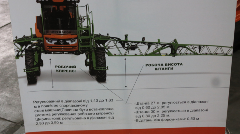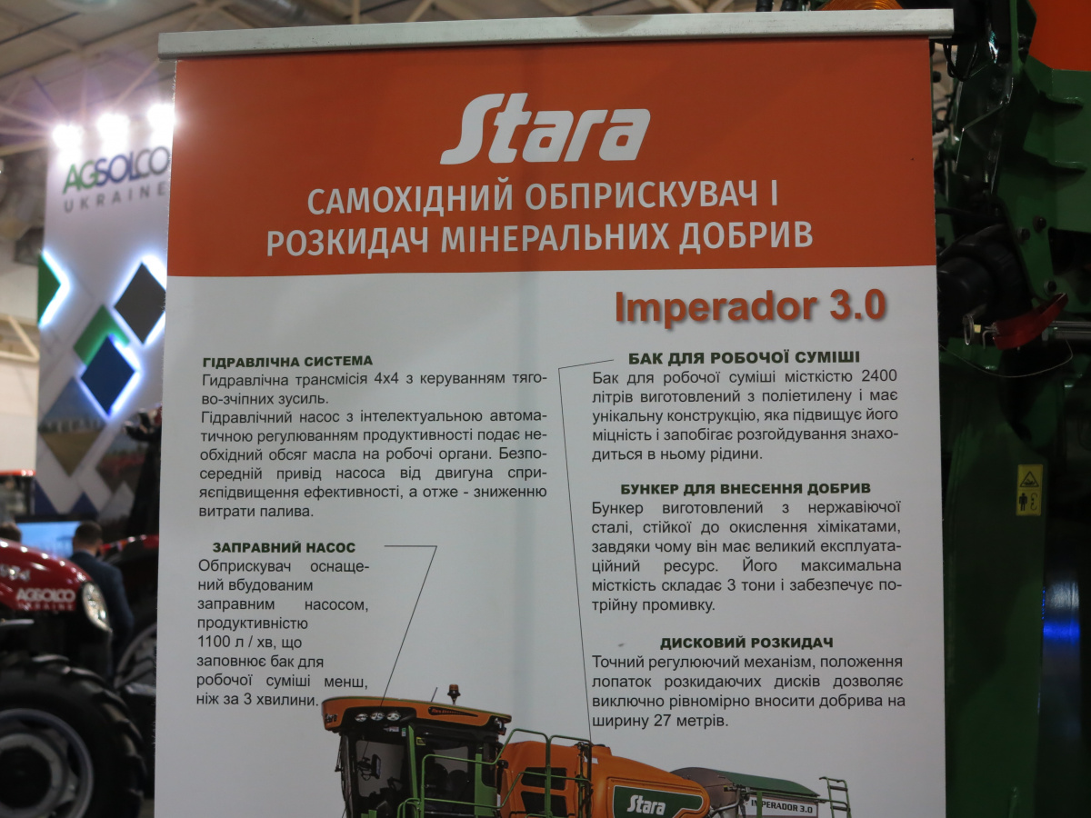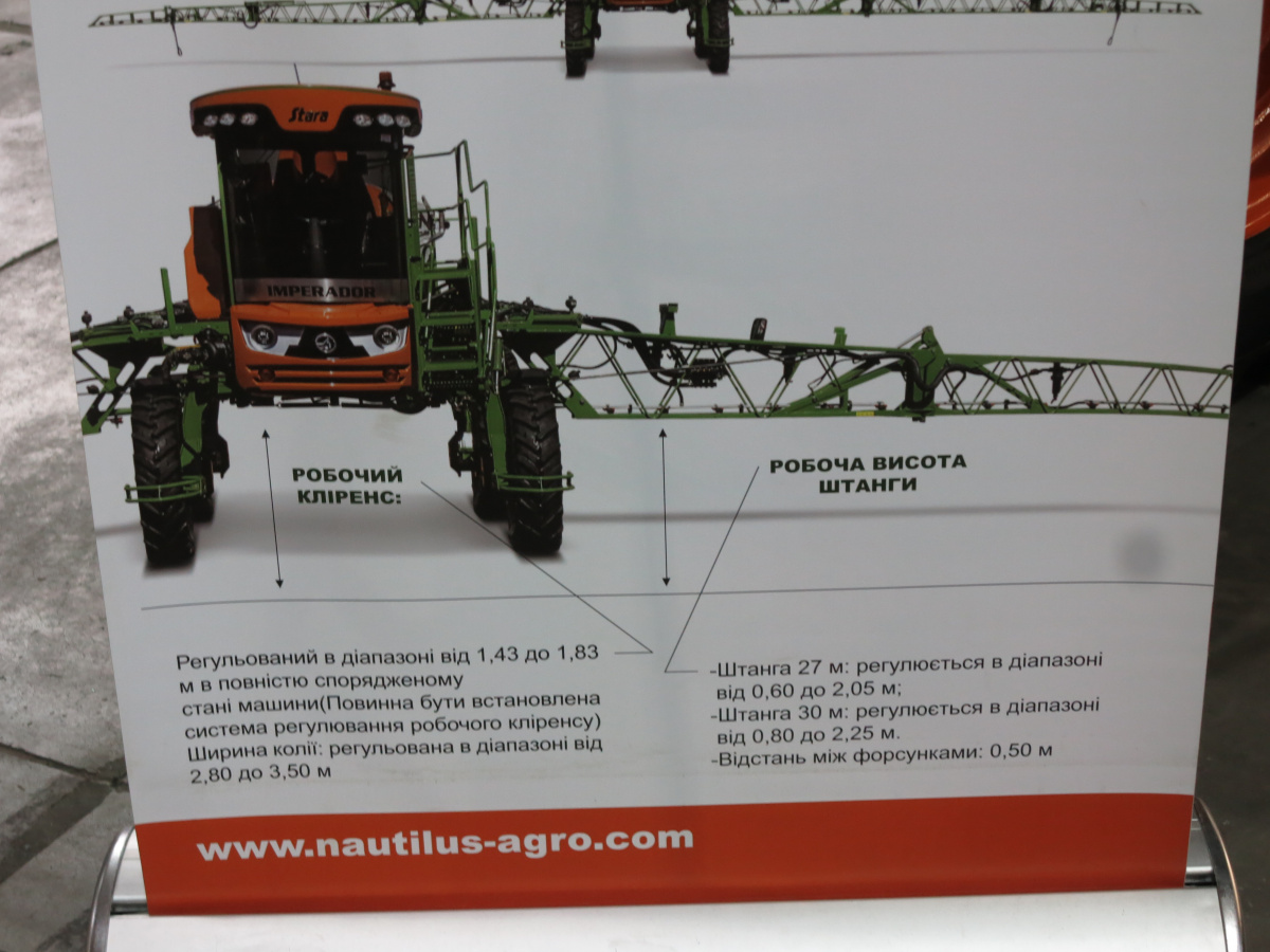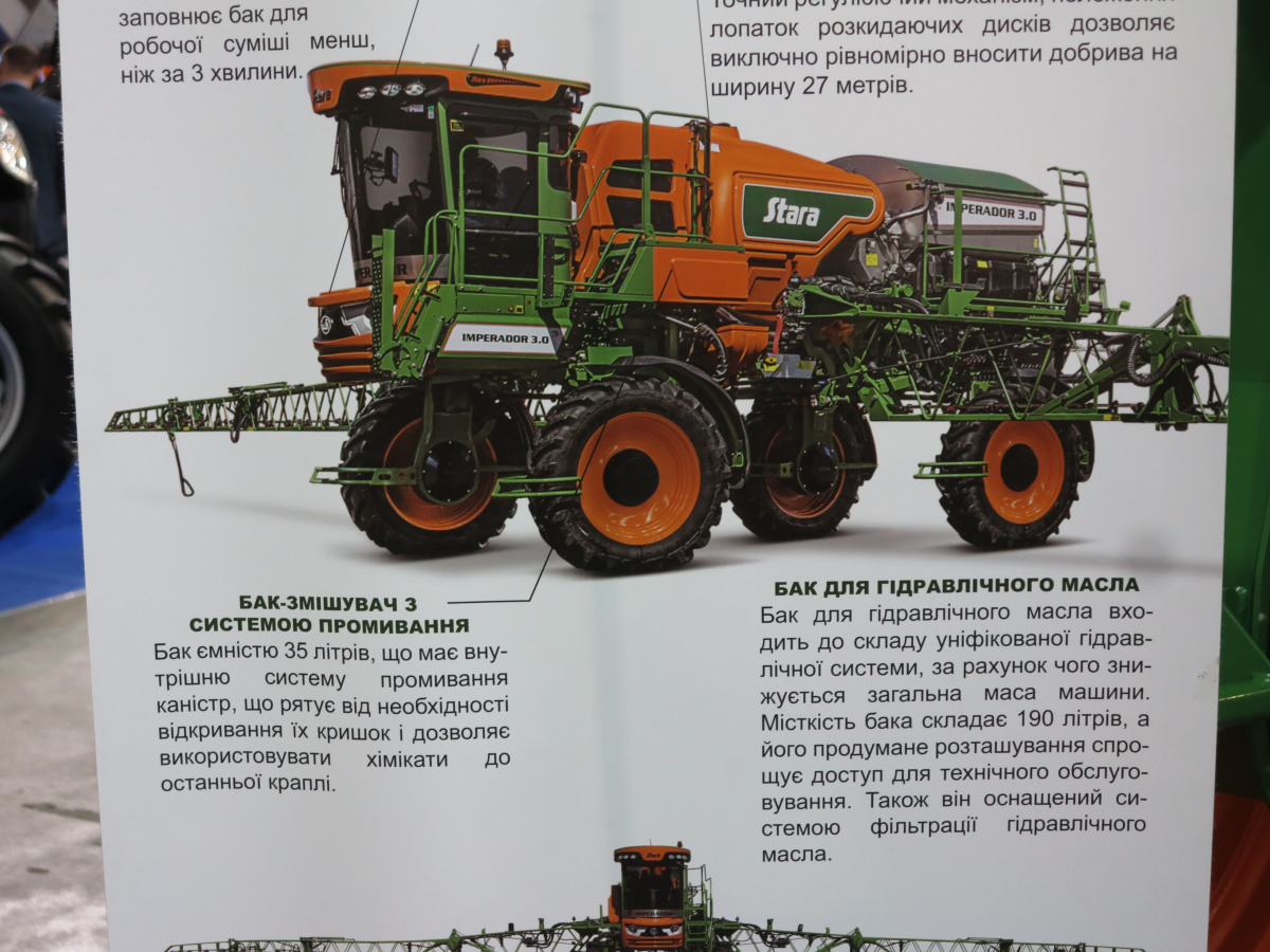 На стенде компании ТОП Агро Лизинг были представлены две машины. В первую очередь стоит отметить модель Imperador 3100. Это первый и единственный в мире опрыскиватель с центральным расположением штанги. Центральное расположение штанги позволяет ей сохранять стабильное положение над посевами в сложных условиях работы и при работе на полях с неровным рельефом. Также опрыскиватели этого семейства имеют лучшие показатели автономности работы среди конкурентов. Его производительность может достигать 65 га в час.