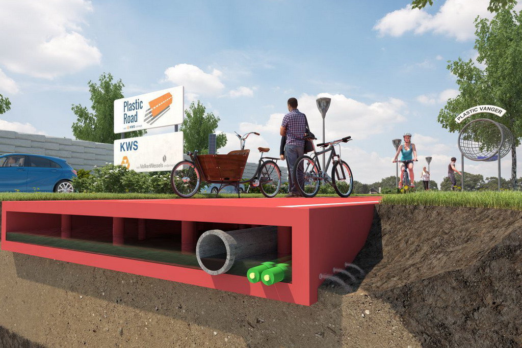Идея создать дорогу не из асфальта или бетона, а из пластика принадлежит компании KWS Infra, которая входит в крупную голландскую машиностроительную компанию VolkerWessels. Инновационный проект назвали просто и понятно PlasticRoad. Он предусматривает изготовление специальных секций дорожного полотна из пластикового мусора – например, бутылок. Такие модули легко можно транспортировать и быстро устанавливать на месте, при этом времени на это потребуется всего несколько недель, а не месяцев как в случае с обычным асфальтобетоном. Интересно, что секции будут сделаны полыми – для прокладки внутри труб, проводов, а также дренажной системы, передает www.autoblog.com