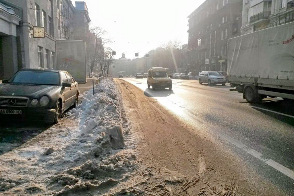 К фото прилагается комментарий автора: «Значит, ГАИ гнали-гнали паркующихся на полосе для общественного транспорта на ул. Саксаганского, да не выгнали. Полиция гнала-гнала, да не выгнала. Активисты гнали-гнали, да не выгнали. И тут пришли коммунальщики, просто насыпали снега на полосу – и вуаля! Всегда пустая полоса от автомобилей, и от общественного транспорта!»