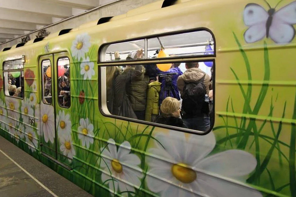 Первый цветочный вагон метро презентовал в Киеве в субботу, в преддверии Международного женского дня – 8 Марта. Он будет ходить в составе поезда на Куреневско-Красноармейской линии целый год. Кстати до конца года уличные художники обещают расписать еще два вагона метро.