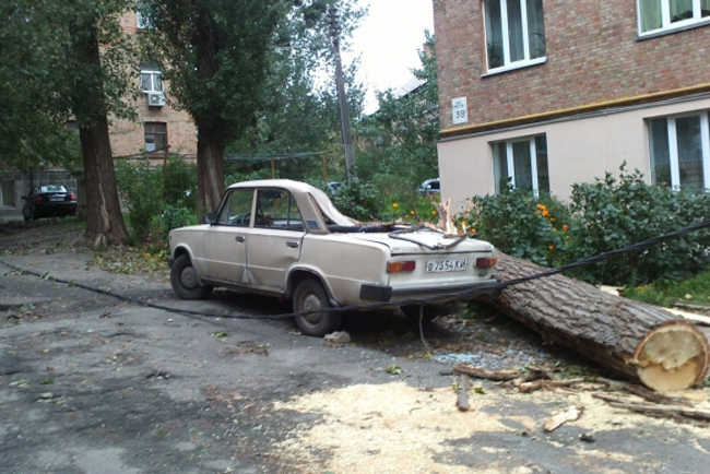 На Стратегическом шоссе, 39 в Голосеевском районе на автомобиль ВАЗ упал большой тополь. Ударившись об машину, дерево еще раз разломилось. В машине в тот момент никого не было. «Дерево упало из-за сильного ветра. В 9:00 прибыли работники «Зеленстроя» и с помощью бензопилы разрезали его на куски. А вечером владелец авто разобрал ее на детали. Машина долго не ездила. Если бы дерево упало немного правее, то последствия были бы масштабнее – там стоял целый ряд автомобилей», – рассказал «Вестям» очевидец ЧП Виталий Белошицкий. По его словам, тополь также оборвал провода. Причем электричество коммунальные службы не выключали. «Провода были разбросаны по земле, а обрывки на столбах сильно «коротили». Были вспышки и дым», – говорит он.