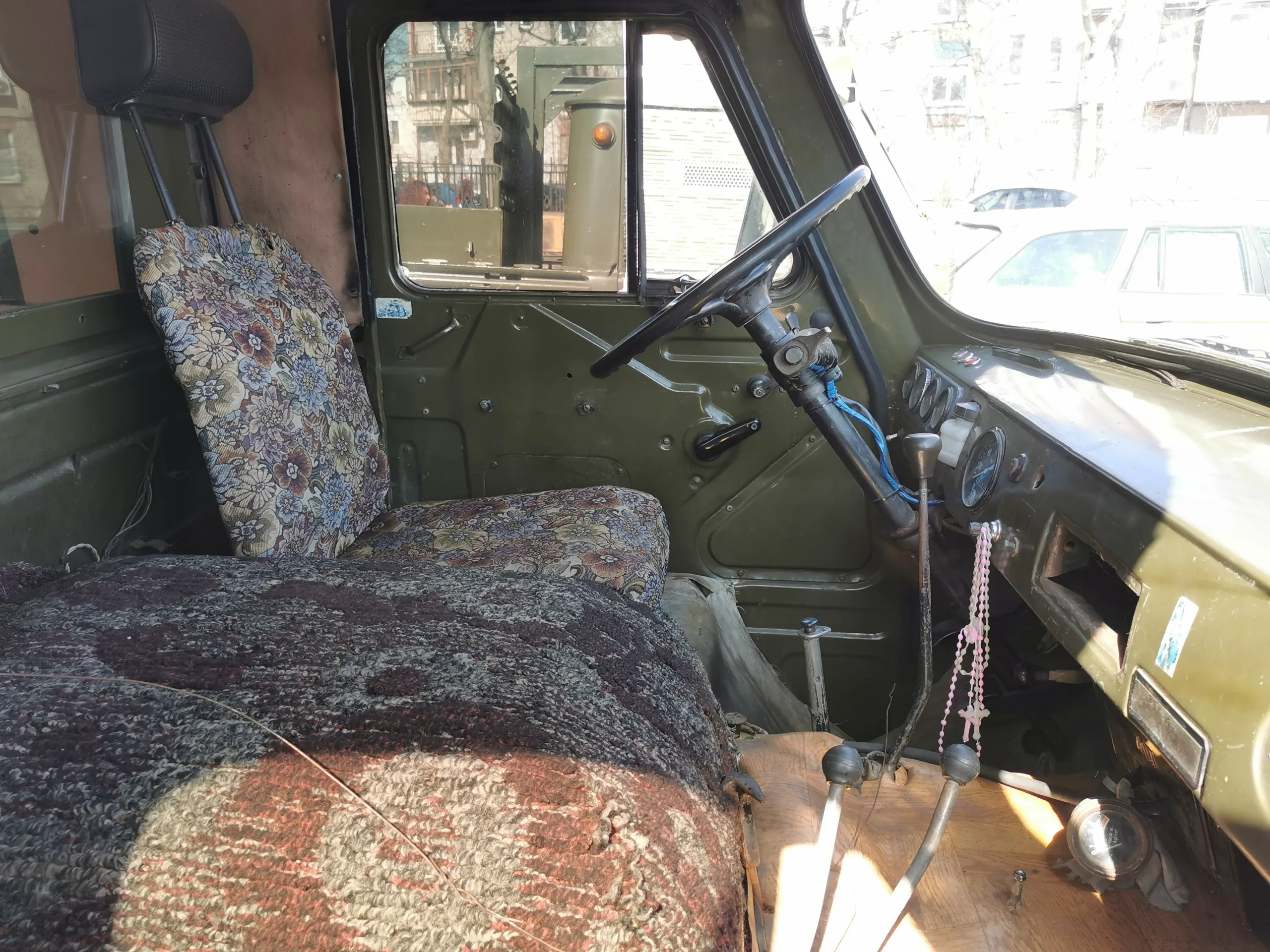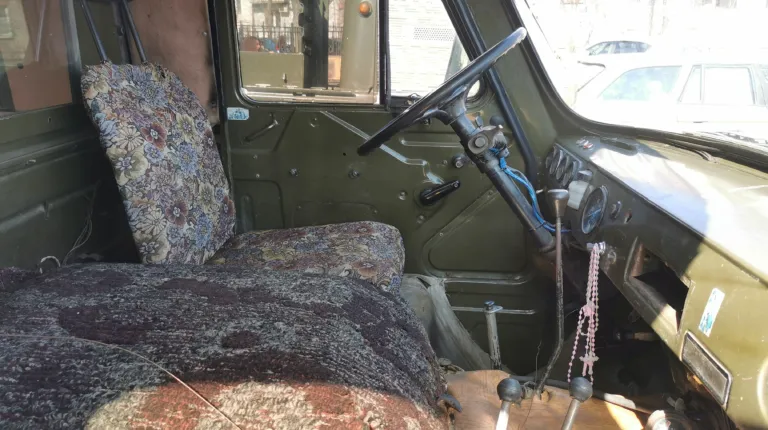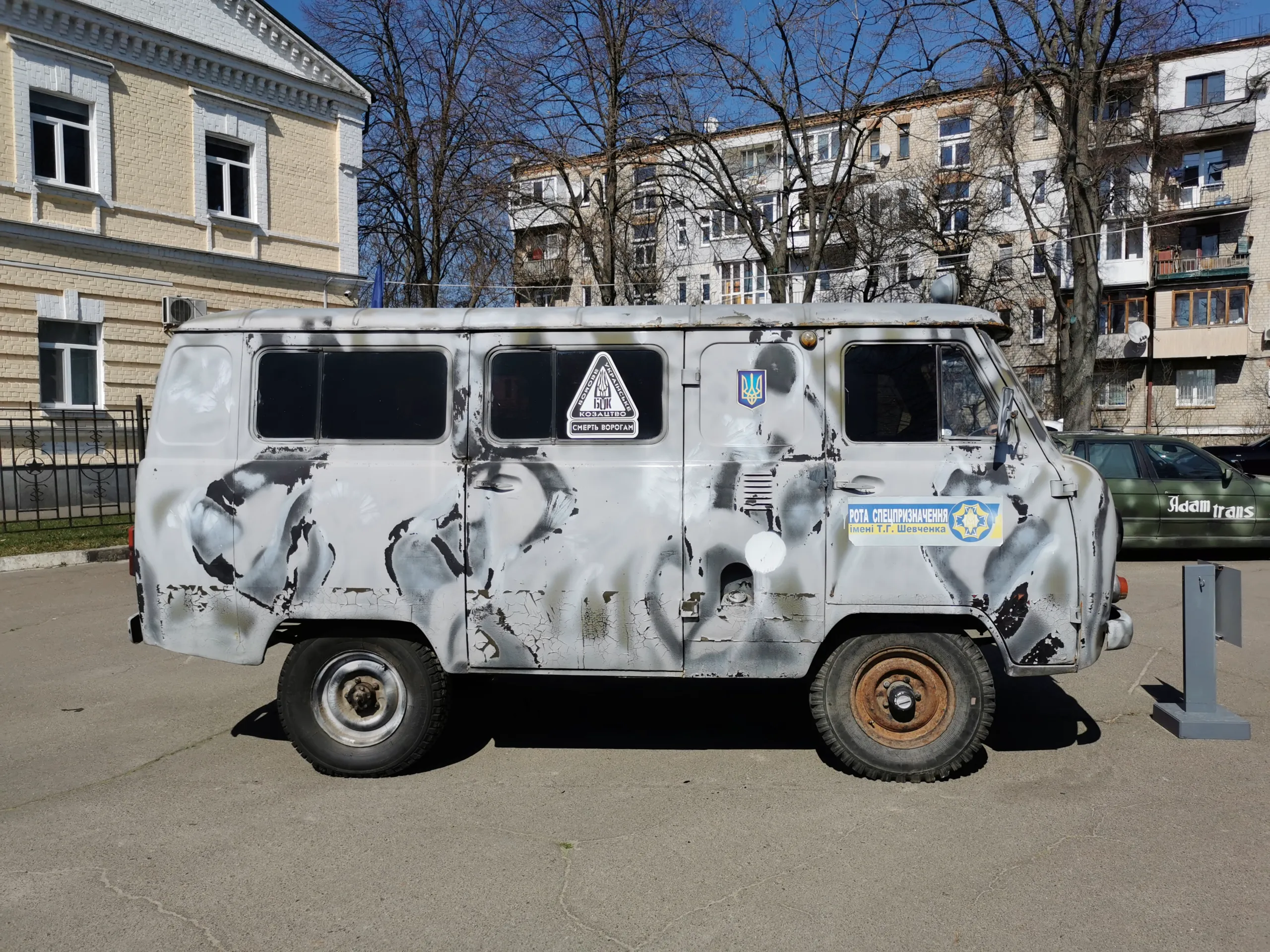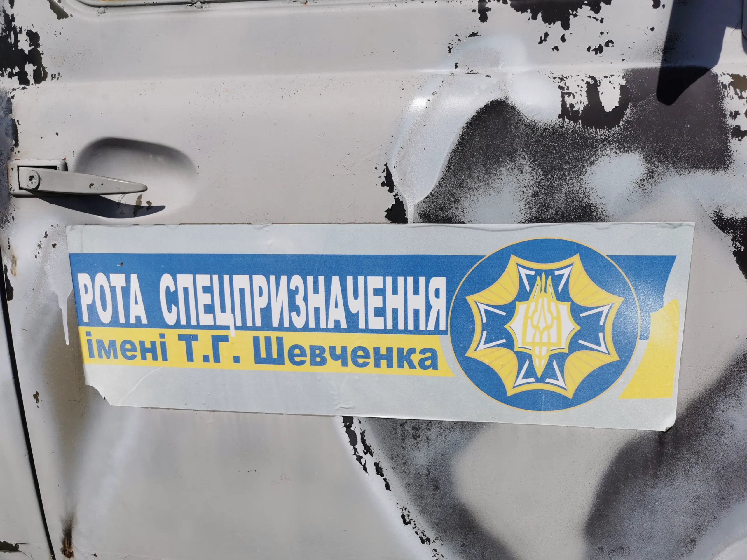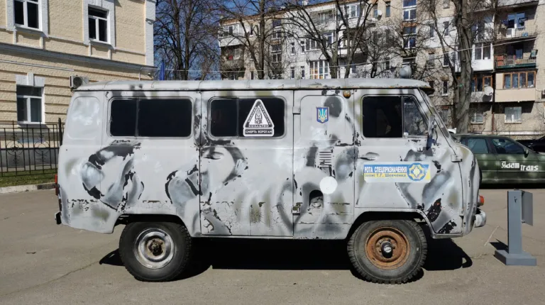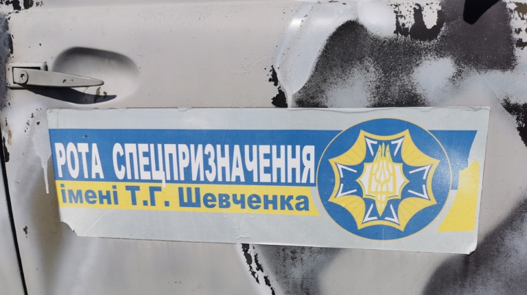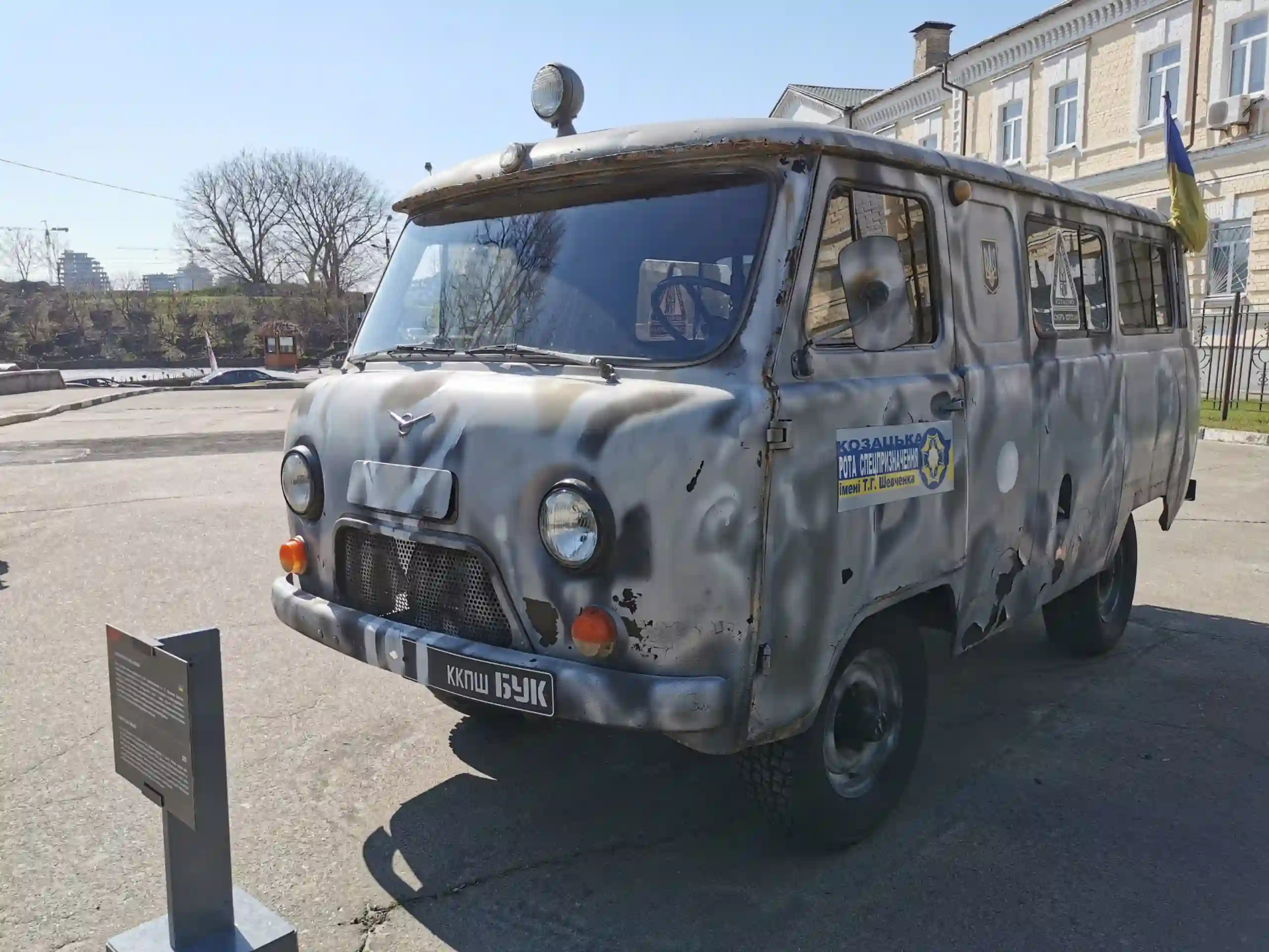 Начнем с микроавтобуса УАЗ-3962 «Ракета». Автомобиль принадлежал бойцам добровольческой роты спецназначения им. Т. Г. Шевченко Боевого украинского казачества («БУК»), которые с июля 2014 года выполняли задания по охране государственной границы на участке Донецкого пограничного отряда в пункте пропуска «Новоазовск», в г. Мариуполь и его окрестностях.