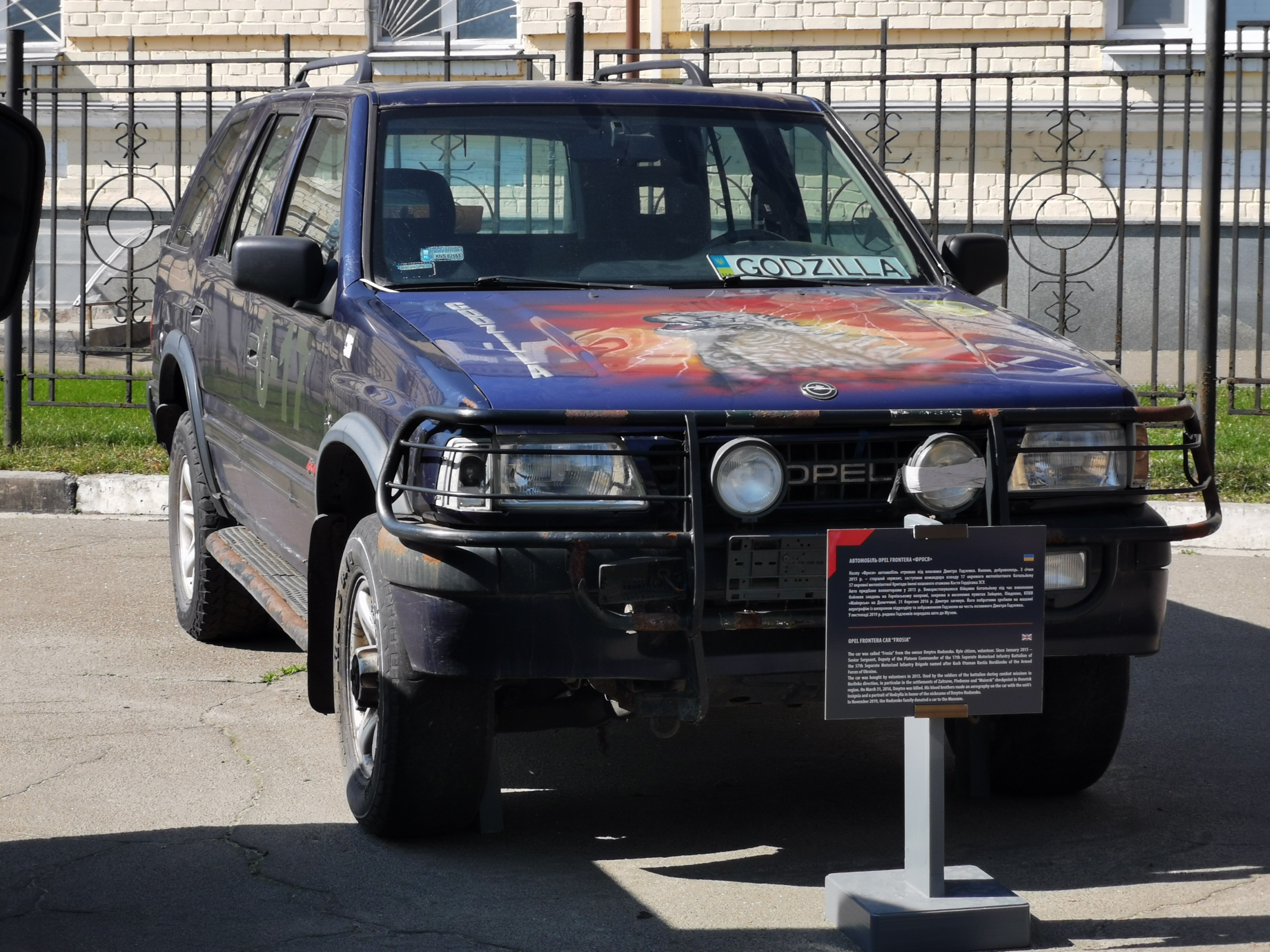 А теперь расскажем о внедорожнике Opel Frontera «Фрося». Свое название машина получила от владельца Дмитрия Годзенка. Киевлянин, доброволец. С января 2015 года – старший сержант, заместитель командира взвода 17 отдельного мотопехотного батальона 57 отдельной мотопехотной бригады имени кошевого атамана Костя Гордиенка ВСУ.