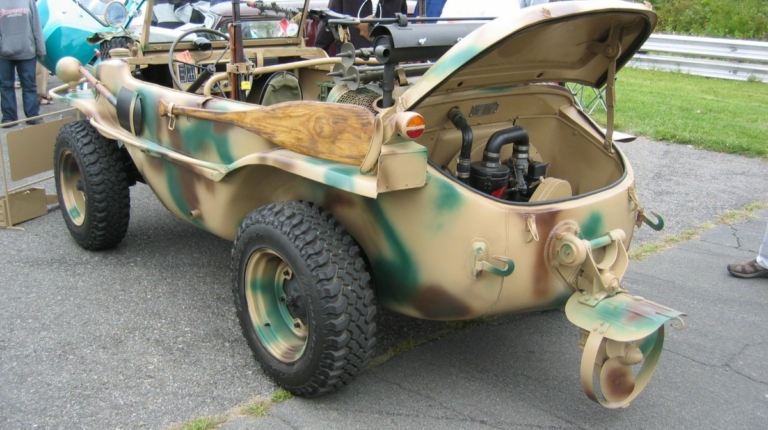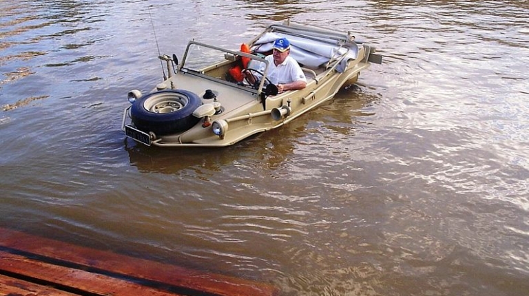 А теперь о настоящих плавающих автомобилях Volkswagen. Это были армейские полноприводные машины Volkswagen 166, созданные знаменитым конструктором Фердинантом Порше. С конца 1942 до октября 1944 года изготовили 14 283 такие амфибии. Стандартный «воздушник» мощностью 25 л.с., расположенный сзади, имел привод на откидной водоходный винт. Максимальная скорость по шоссе – 80 км/ч, а на плаву – до 10 км/ч.