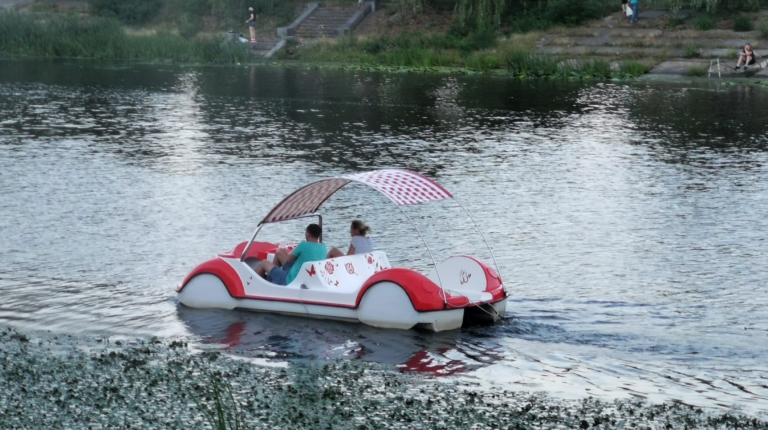 На Русановском канале в Киеве этим летом появился новый вид развлечения – катание на необычных с виду плавсредствах. Это катамараны, которые по дизайну довольно точно повторяют легендарный Volkswagen Beetle – достаточно посмотреть на характерные полукруглые крылья со светотехникой.