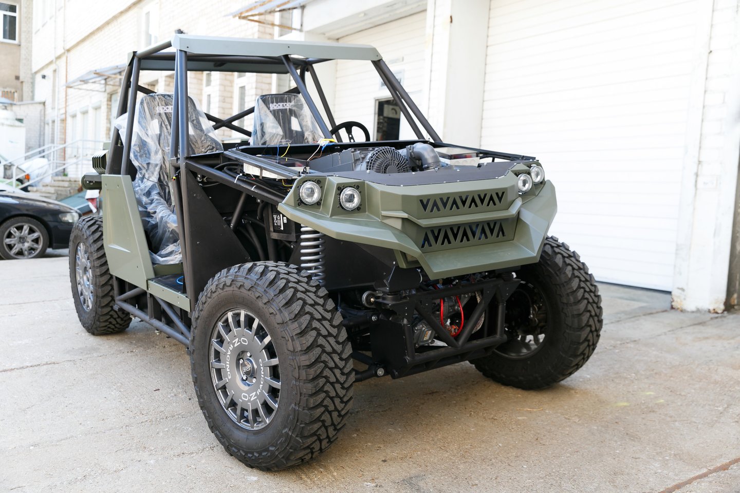 Гібридне баггі (Д/Ш/В: 3200/1800/1900 мм) розраховане на двох осіб (тут стоять спортивні крісла Sparco з 4-точковими ременями безпеки). Плюс до цього можна перевозити до 500 кг вантажу, що дає змогу встановити бойовий модуль. Повна маса машини — до 2500 кг.