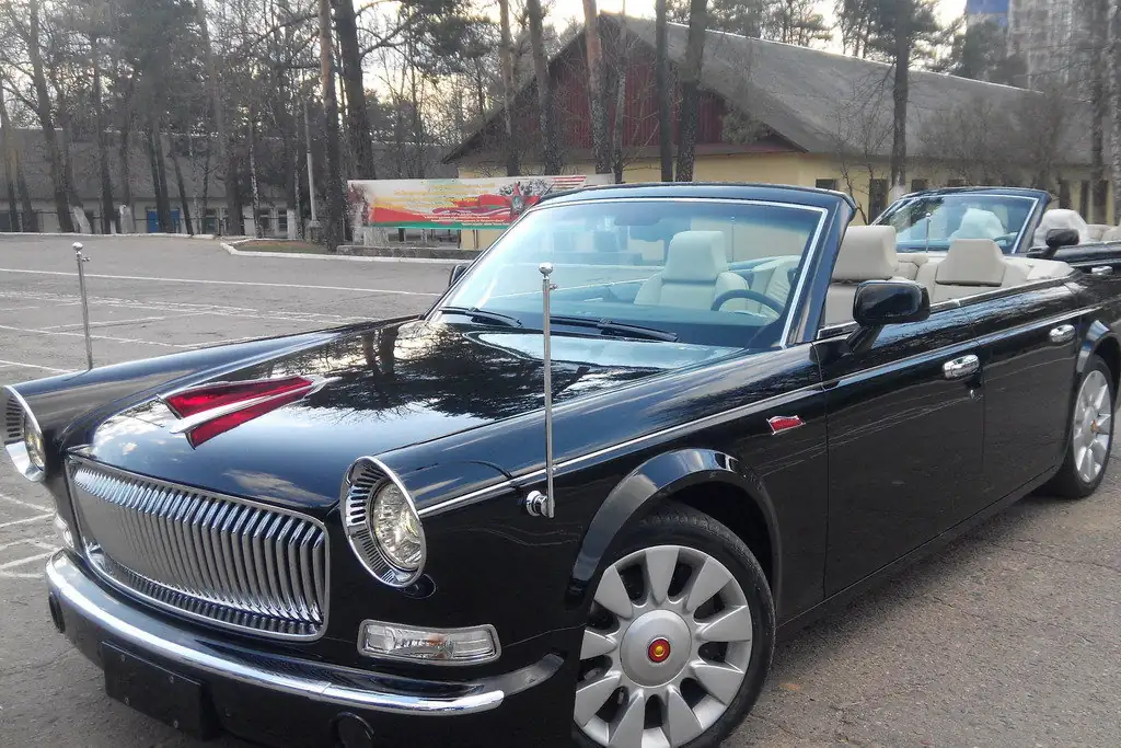 Китайские парадные кабриолеты прилетели в Беларусь Внешне автомобили HongQi L5 напоминают старую советскую «Волгу» ГАЗ-21, а сзади – Rolls-Royce. Капот автомобиля украшен красным знаменем, что, с одной стороны символизирует государственный флаг Китайской Народной Республики, а с другой – советское Знамя Победы. Зато внутри «Красное знамя» не имеет ничего общего с антикварной техникой: автомобиль имеет современную ЖК-панель приборов, автоматическую коробку переключения передач, магнитолу с CD-ченджером и новейший круиз-контроль. Отделка салона выполнена из натуральной кожи светлого цвета и полированного дерева.
