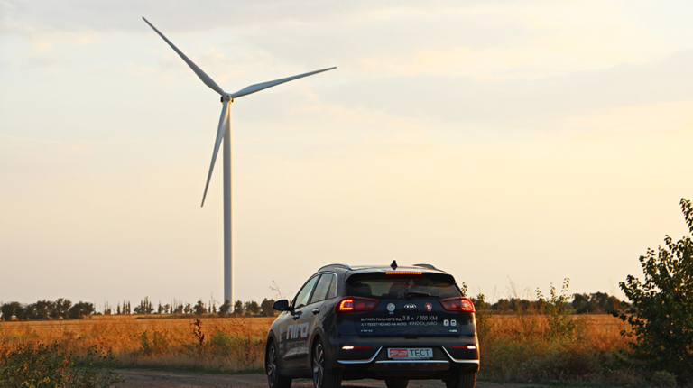 Очаковская станция действительно украинская, 2012 года, а не досталась в наследство от СССР, как многое другое. Четырнадцать ветряков общей мощностью 37,5 мегаватт установлены на расстоянии 500 м друг от друга. Каждый высотой 100 метров и плюс еще гондола с генератором, трансформатором и прочим оборудованием. Как и наш новый гибрид – Kia Niro, ветряк получает электрическую энергию практически из ниоткуда – от ветра. Даже когда на земле полный штиль, там, на 100 – метровой высоте, есть движение воздуха, который вращает трехлопастный вентилятор и выдает желанные киловатты.