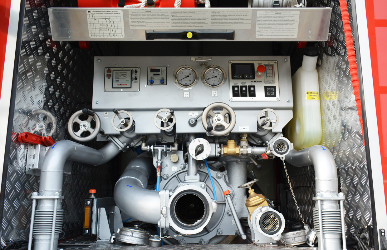 Автоцистерна имеет запас воды 4000 л. Применяется автономная, полуавтоматическая системы водозаполнения с электронасосом шиберного типа. Пожарный насос – центробежный, ПН-60Б-Р-Р. Подача насоса составляет 3600 л/мин (60 л/с). Напор насоса – 100 м. Наибольшая геометрическая высота всасывания – 7,5 м. Продолжительность заполнения насосы при максимальной геометрической высоте всасывания – не более 60 с.