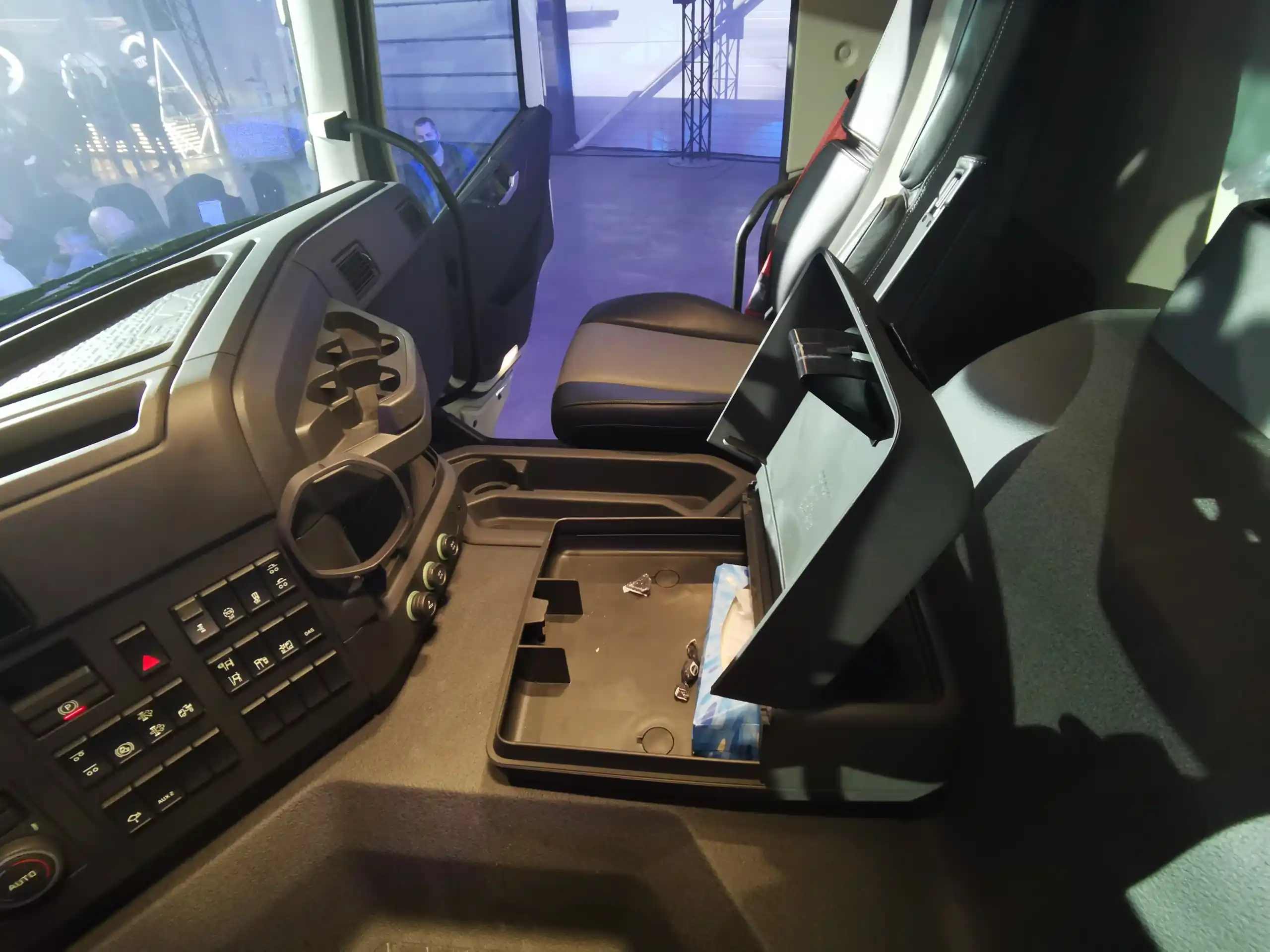 Что касается рабочего места водителя, то там удалось улучшить переднюю обзорность на 10%. И все эти новации сделаны без компромисса касательно прочности кабины и защиты в случае аварии. В нижней части пассажирского зеркала появилась новая боковая камера, которая помогает увидеть, что происходит в слепой зоне со стороны пассажира - теперь ее просто не существует. Изображение с камеры выводится на боковой дисплей.