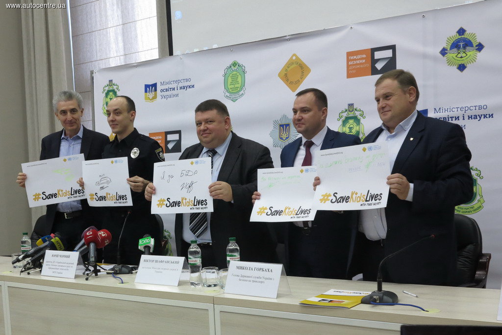 Участники пресс-конференции также подписали Детскую декларацию по безопаности дорожного движения. Слева направо: Игорь Диденко – народный депутат Украины, председатель подкомитета по вопросам безопасности автодорожного движения Верховной Рады; Владислав Власюк – заместитель начальника Департамента патрульной полиции МВД Украины; Юрий Черный – директор Государственного предприятия «Украинский медицинский центр безопасности дорожного движенияи информационных технологий» Министерства здравоохранения Украины; Николай Горбаха – Председатель Государственной службы Украины по безопасности на транспорт; Сергей Дятленко – заместитель директора Департамента общего среднего и дошкольного образования Министерства образования и науки Украины.