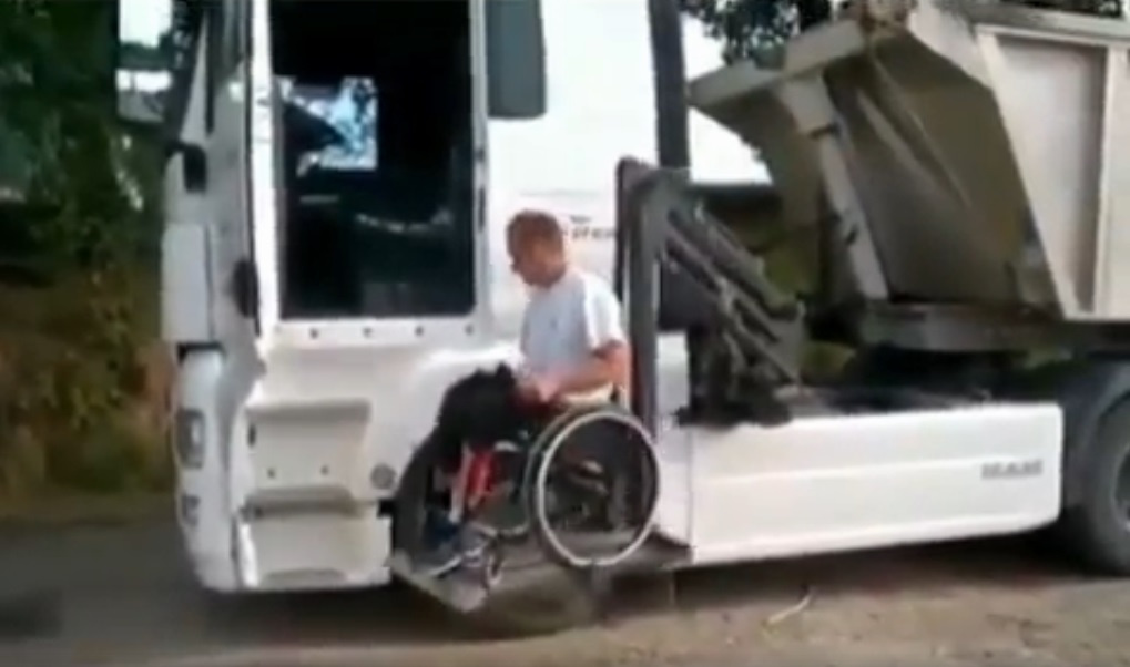 Многие спросят, а как же водитель на инвалидной коляске будет садиться в кабину грузовика, расположенную довольно высоко от земли. Оказывается, все решаемо. На седельный тягач MAN TGX за кабиной установили специальный гидролифт, который позволяет водителю в коляске добраться до своего рабочего места. После того как человек садится за руль, он собственноручно складывает коляску и убирает ее в кабину. Затем в транспортное положение складывается гидролифт.