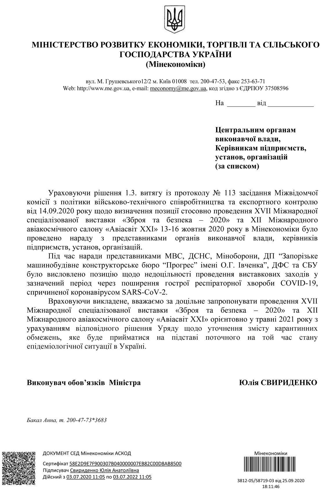 Что же касается нового решения, то в нем сообщается, что во время совещания в Министерстве экономики, торговли и сельского хозяйства Украины представители МВД, ГСЧС, Минобороны, ГП «Запорожское машиностроительное конструкторское бюро «Прогресс» им. А.Г. Ивченко», ГФС и СБУ была высказана позиция о нецелесообразности проведения выставочных мероприятий в указанный период из-за распространения острой респираторной болезни СOVID-19, вызванной коронавирусом SARS-CoV-2.