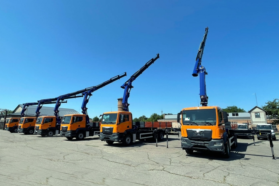 Завод спецтехніки Техкомплект поставив для компанії “Автострада”, що займається будівництвом доріг в Україні, шість бортових автомобілів MAN TGS 33.440 (6х4) з краном-маніпулятором італійської марки PM.