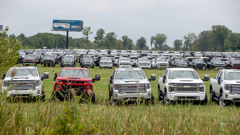 Одна из них организована в поле у города Флинт (штат Мичиган, США). На ней сосредоточено несколько сотен новых пикапов Chevrolet Silverado и GMC Sierra. Стихийная стоянка выглядит довольно удручающе и больше напоминает кладбище для старых машин. Стоит отметить, что автомобили стоят под открытым небом довольно продолжительное время, и смогут ли после этого отправиться к дилерам большой вопрос.