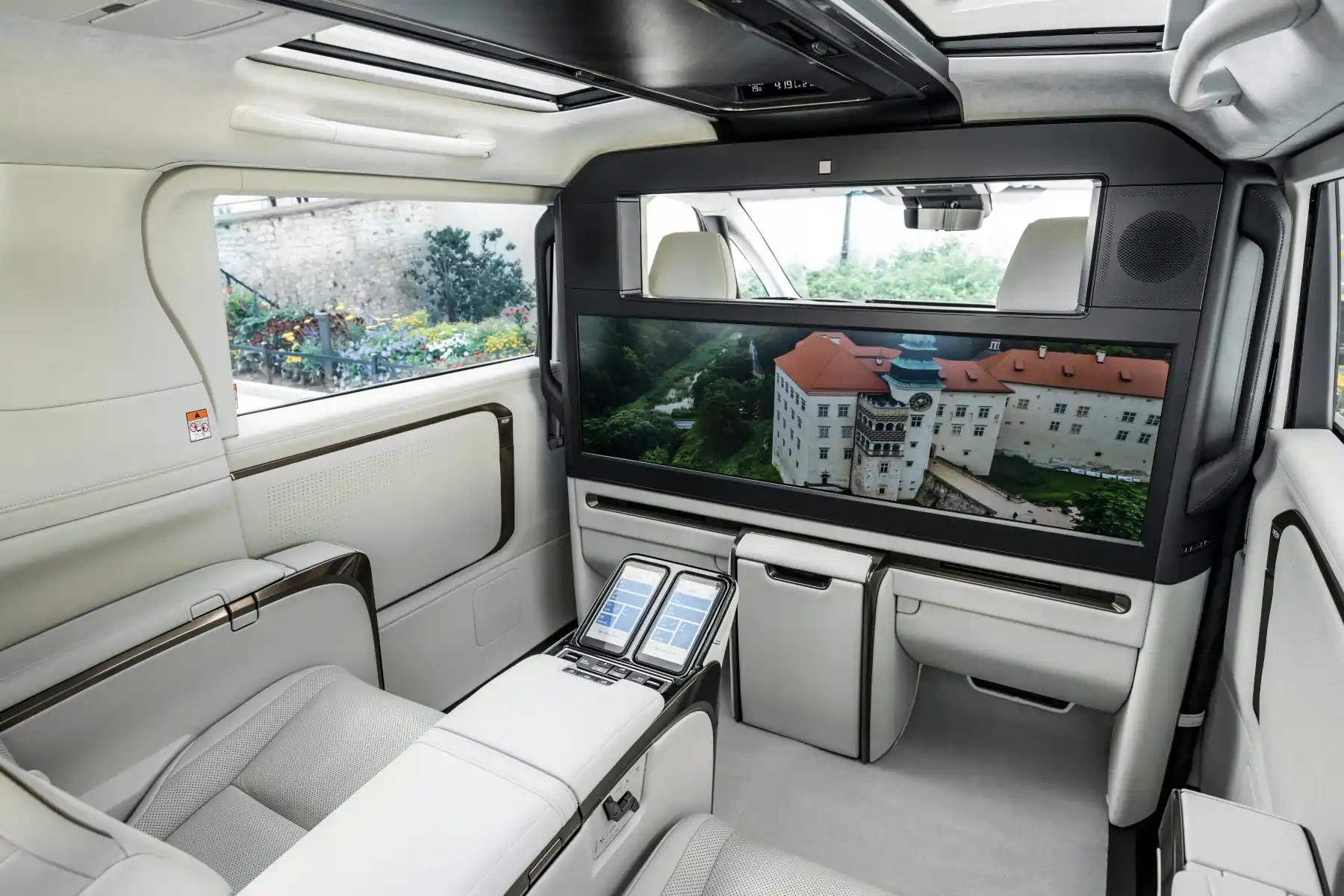 Двері у нового LM розсувні та дають вільний доступ до просторого салону новинки. Компонування трирядне з шістьма або сімома сидіннями. Найбільш розкішна версія має дворядну комбінацію із чотирма кріслами. У салоні встановлений величезний 48-дюймовий екран, який можна використовувати для проведення онлайн-зустріч прямо під час руху. Також є холодильник, висувний столик та 64-колірне фонове освітлення.