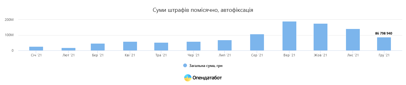 Так, за даними платформи Опендатабот, за 12 місяців 2021 року тільки завдяки дорожнім камерам було зафіксовано 1,742 млн порушень і виписано 2,584 млн штрафів на суму 1,029 млрд гривень. Найбільша кількість протоколів була сформована системою в листопаді минулого року (441 585 штук), а ось за сумою санкцій лідером став жовтень – 189,7 млн гривень.