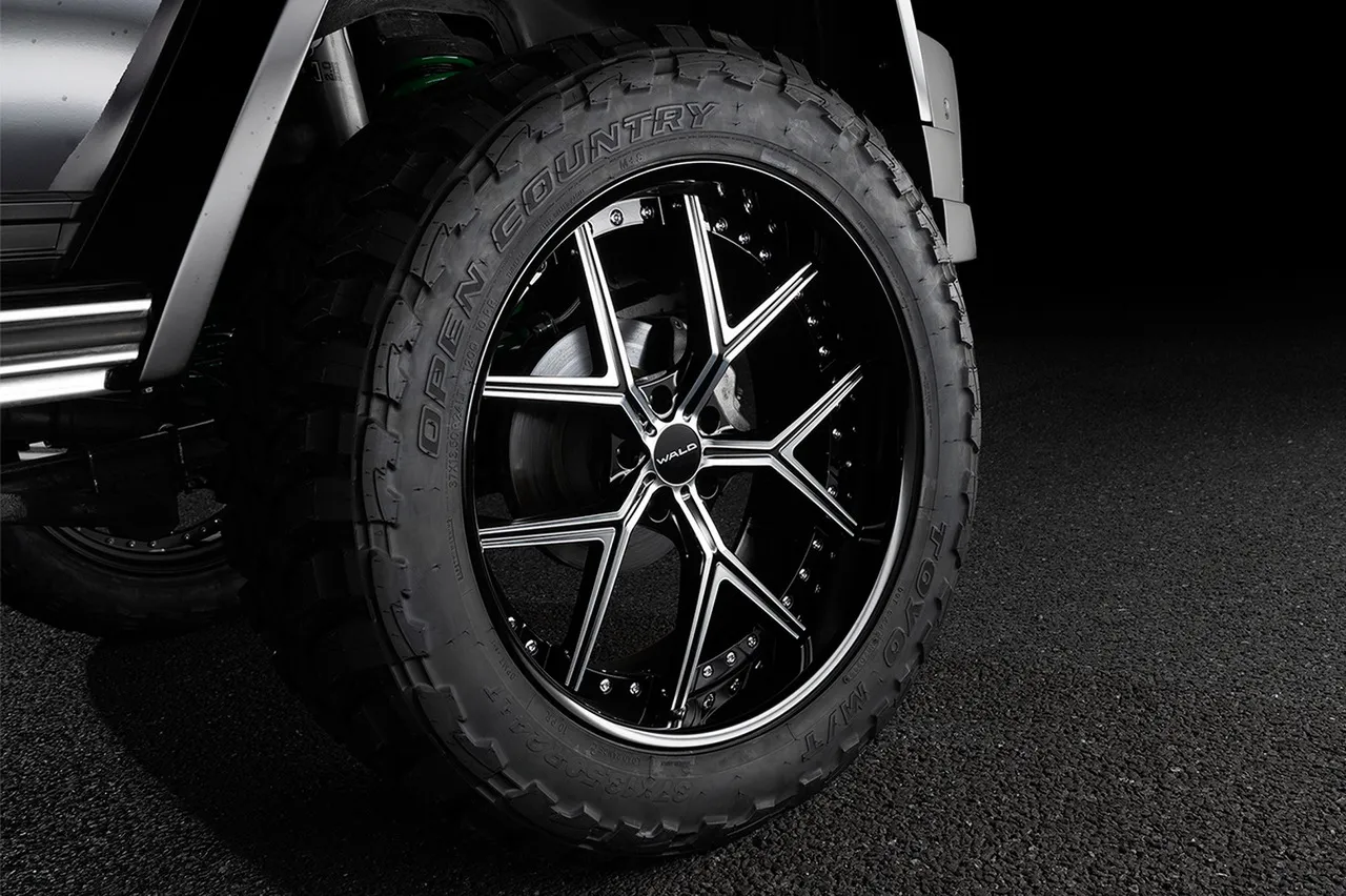 Сзади – новый бампер и агрессивный диффузор. Специально для этого проекта специалисты WALD International разработали уникальные 24-дюймовые колесные диски с Y-образными спицами. Плюс к этому прошлый Гелендваген оснастили спортивной выхлопной системой, которая обеспечит посвежевшему внедорожнику внушительный «рык».