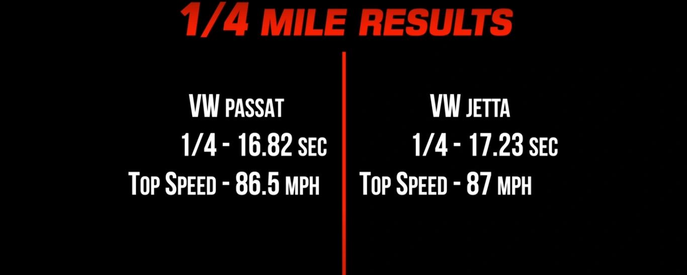 Гонка вийшла видовищна. Вона вкотре продемонструвала, що потужність і крутильний момент вирішують все. Так, завдяки повному приводу та високій віддачі мотора Passat вийшов у лідери. Він подолав чверть милі за 16,82 секунди, а Jetta — за 17,23 с.