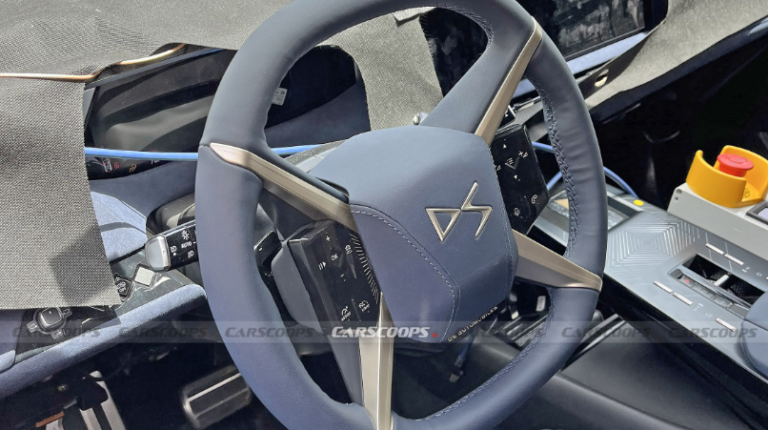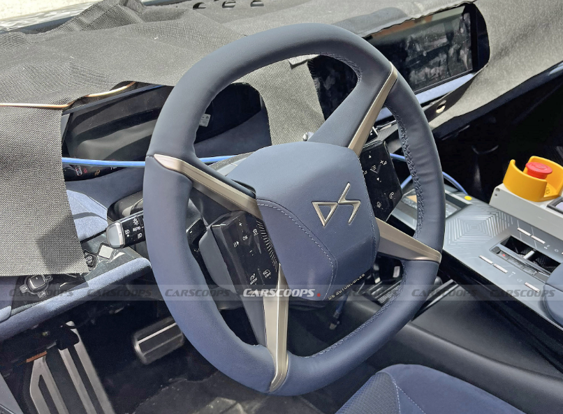 Шпигунам вдалося заглянути і в салон DS8. Можна відзначити наявність чотириспицевого керма і високотехнологічної центральної консолі, а також великого екрану, який поєднує в собі цифрову панель приладів і мультимедійну систему. Оздоблення виконано синьою шкірою.