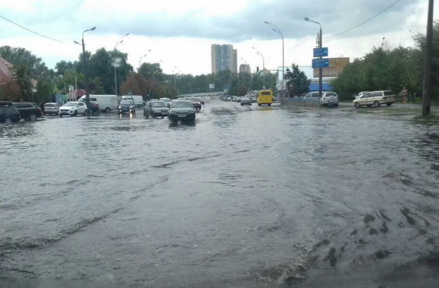 Вулиці Києва перетворились на бурхливі річки, а інфраструктура на справляється з рекордними опадами. Подекуди к дощу добавляється град, а вітер трощить дерева. Подекуди вже утворились гейзери, річки і плавають автівки й сміттєві баки.