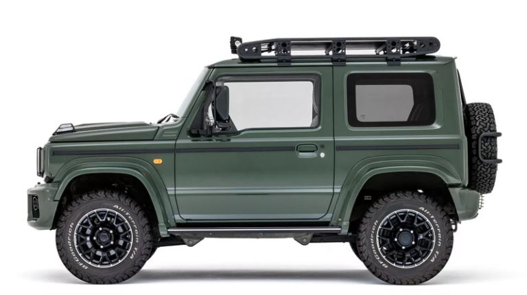 На автомобіль встановили новий передній бампер, розширювачі крил та алюмінієві підніжки. Ще він отримав перероблену решітку радіатора з хромованими вставками, захисні сітки на фарах та поворотниках, розташованих на капоті. Останній теж допрацювали і тепер він додає брутальності Jimny.
