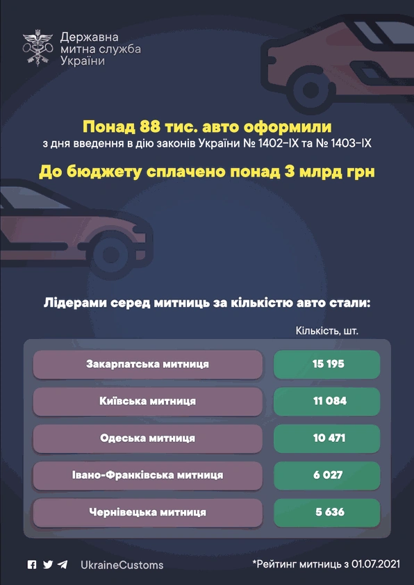 За даними Державної митної служби України, за зазначений період було розмитнено понад 88 тисяч "євроблях". Це принесло до бюджету країни понад 3 млрд гривень. Найбільше перевели на українські номери співробітники Закарпатської митниці — 15 195 одиниць. Також високі показники у Київської та Одеської митниць – 11 084 і 10 471 штук відповідно. Замикають п'ятірку лідерів з розмитнення машин Івано-Франківська (6027 автомобілів) і Чернівецька (5636 машин) митниці.