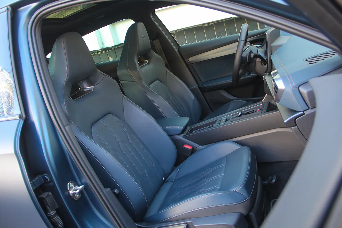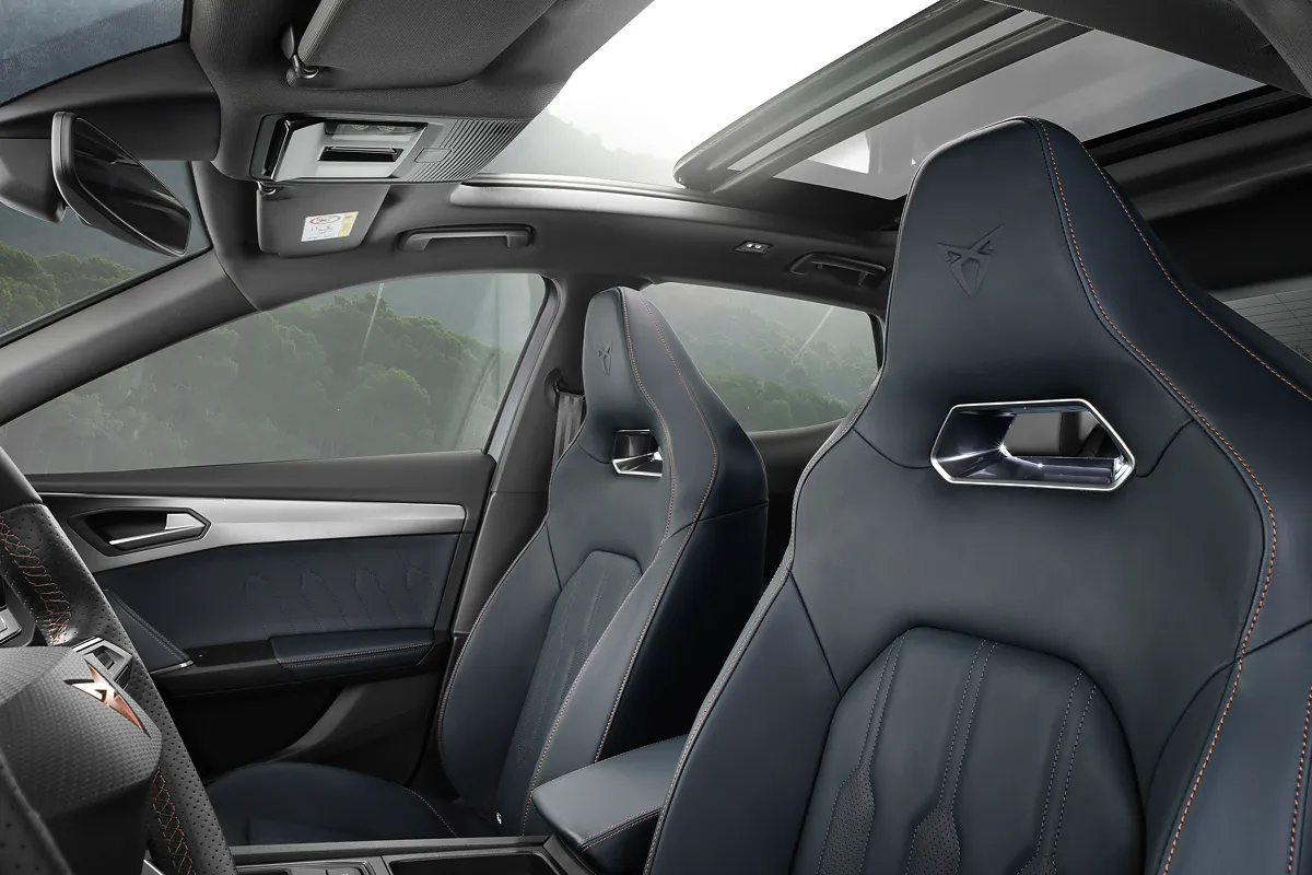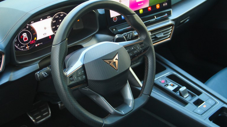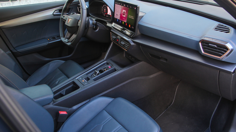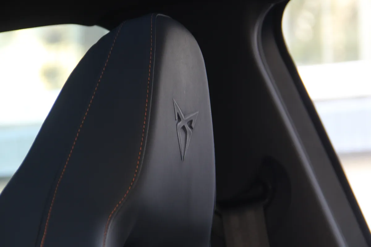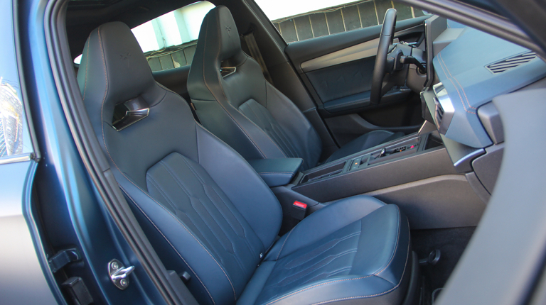 Салон може здатися вже знайомим тим, хто бачив (або керував) новий SEAT Leon. Передня панель тут така ж, як на у Леона, тільки з більш просунутою мультимедійною системою з екраном 12 на дюймів, іншим кермовим колесом і, звичайно ж, спортивними “ковшами” з цільною спинкою і дуже розвиненою бічною підтримкою. Вона не ультимативна, але дуже добре утримує тіло навіть у крутих поворотах. Та й оздоблення багата – шкіряна, під стать кольору автомобіля.