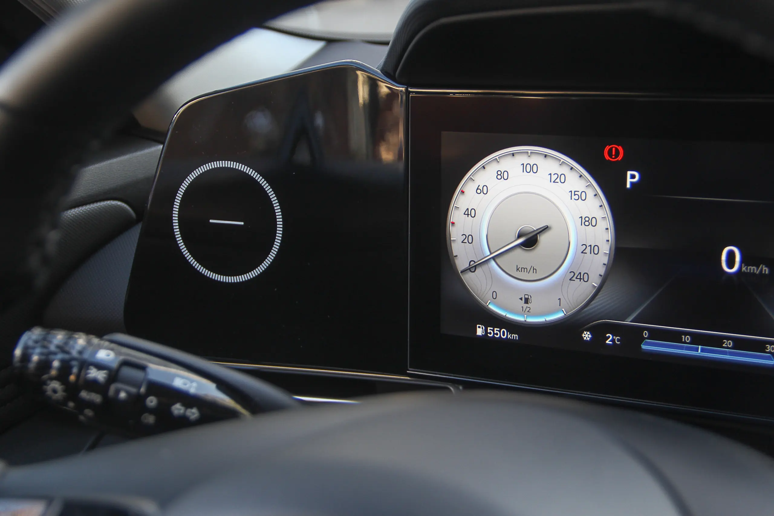 Действительно, на водителя в салоне сделан особый акцент, и с его места это сразу заметно. Экраны по бокам от цифровой приборной панели диагональю 10,25 дюймов чуть повернуты на водителя… Хотя как экраны… Тот, что слева это просто “обманка” и за красивым глянцевым стеклом там ничего нет. Зато почему-то нарисован знак минус (минусовая клемма?), тайный смысл которой так и остался загадкой.