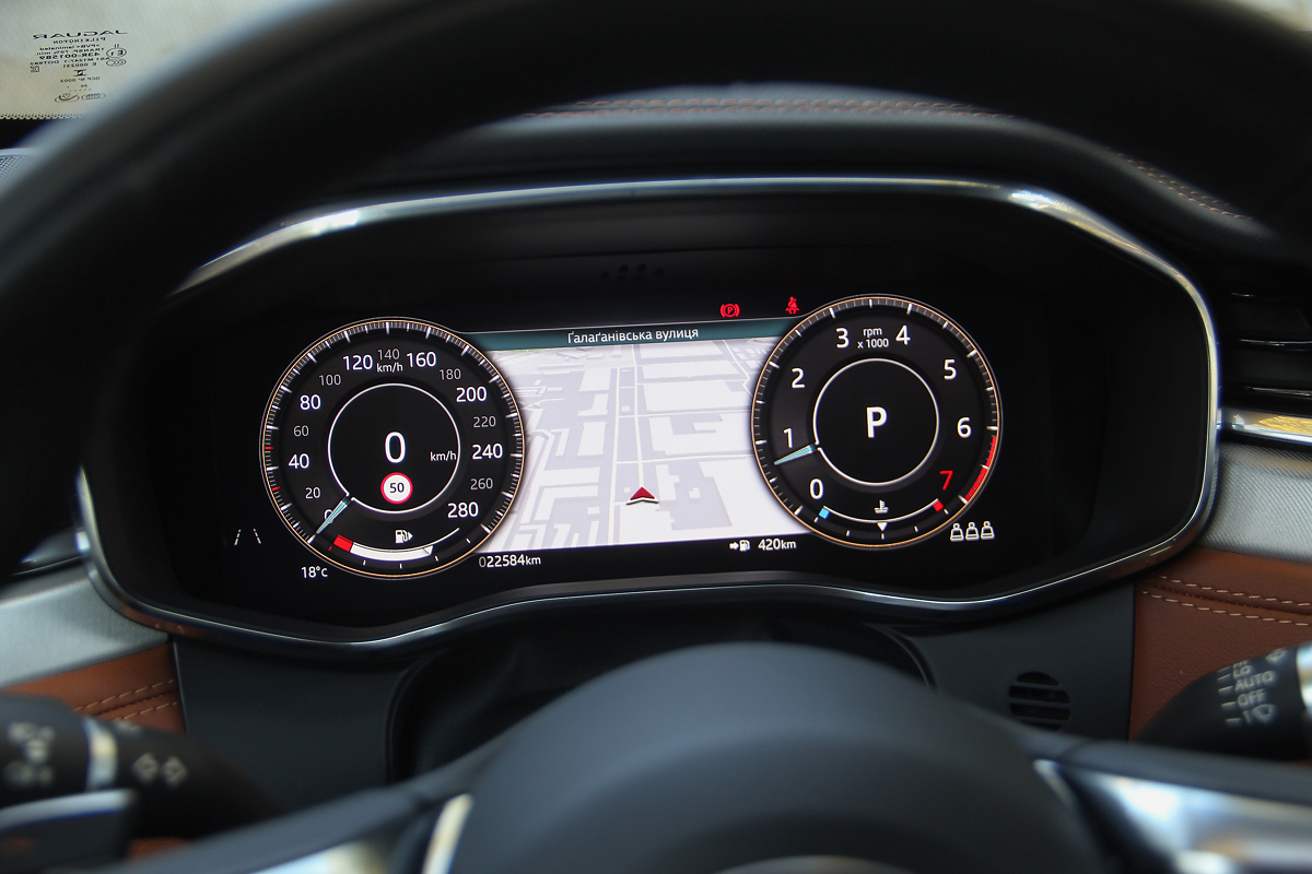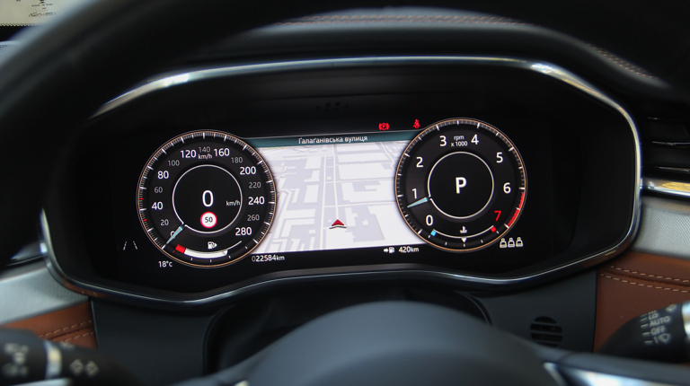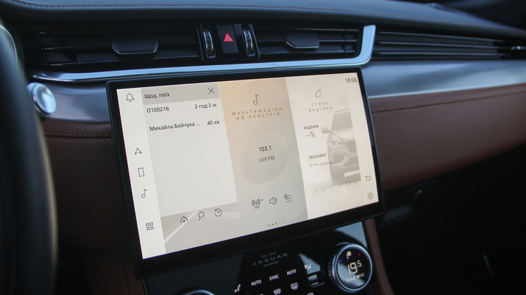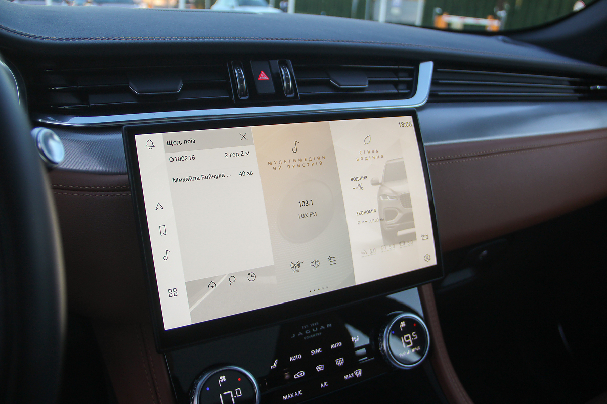Но весь этот ансамбль не был бы полным без самого главного элемента салона обновленного F-Pace — новой мультимедийной системы Pivi Pro c изогнутым HD дисплеем диагональю 11,4 дюйма. Он не прячется в нише, а наоборот, установлен отдельно, слегка отделяясь от передней панели. Здесь абсолютно новый интерфейс и стиль, который хочется похвалить за лаконичность и удобство пользования. Очень продуманно и очень user friendly!