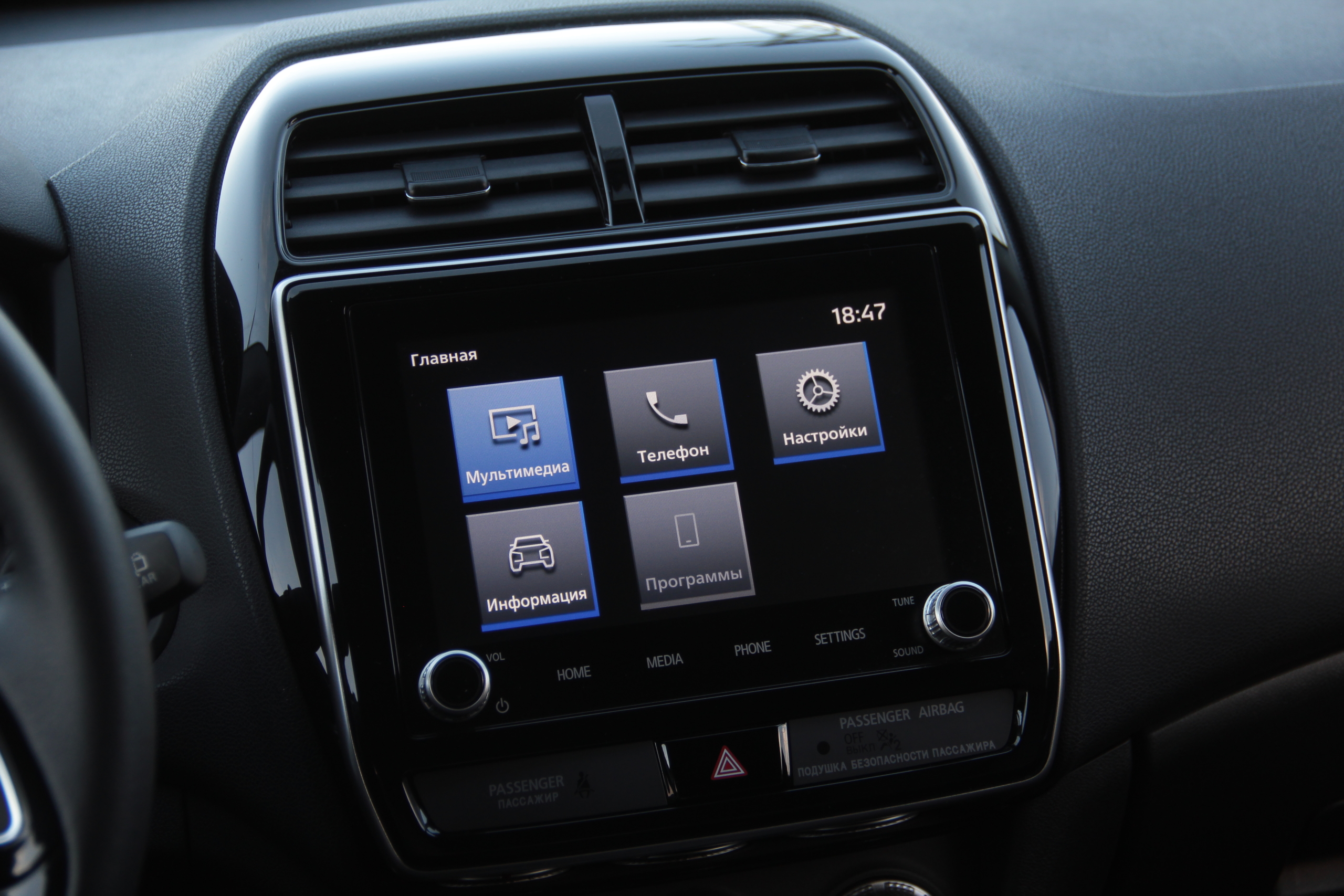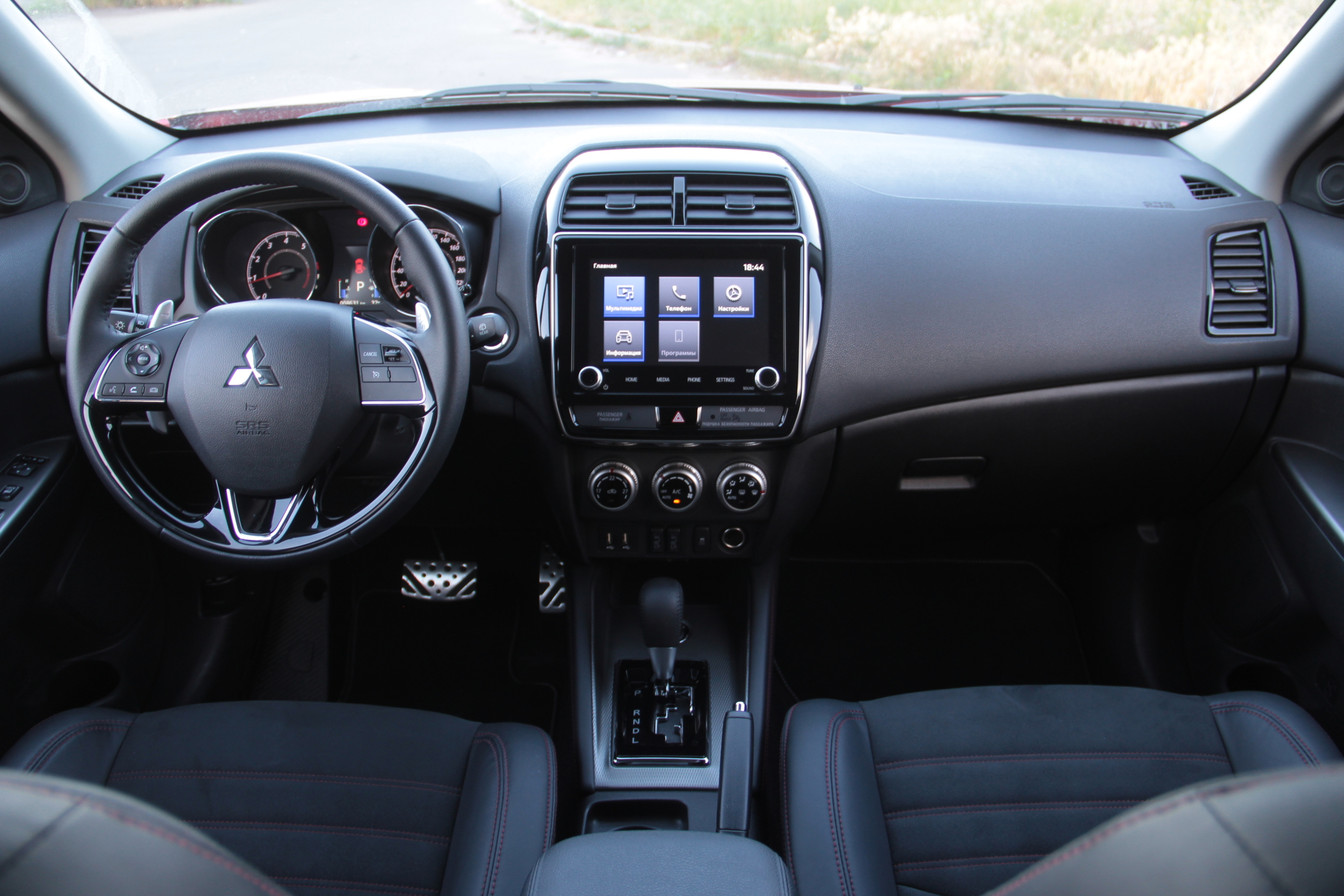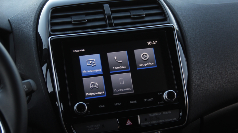 Интерфейс новой мультимедийки уже хорошо знаком нам по другим моделям бренда: Mitsubishi Pajero Sport и Mitsubishi Outlander. Крупные виртуальные клавиши меню, сине-черная схема оформления и никаких излишеств – примерно такое первое впечатление складывается после знакомства с ней. Но здесь есть технологии Android Auto и Apple CarPlay, и вся система больше ориентирована на использование со смартфоном. Кстати, физических кнопок, а точнее “крутилок” всего две, все остальное сенсорное.