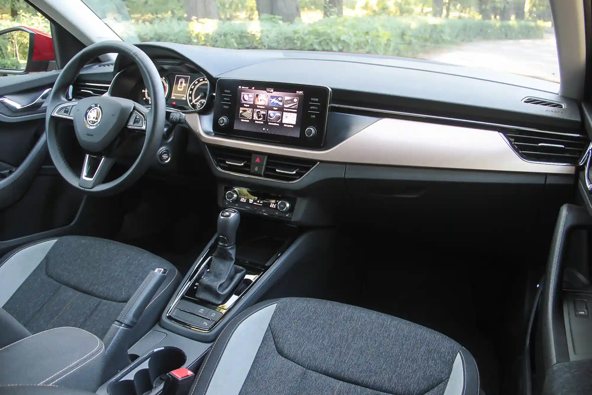 Хотя когда садишься в салон, то на первый взгляд все выглядит довольно скромно и сдержано. Здесь нет французского эпатажа, но, с другой стороны, все не настолько аскетично, как это можно встретить у японских моделей. Мягкие пластики, тканевая отделка дверных карт, приятная вставка по центру торпедо - все это делает интерьер уютнее и немного “дороже”. Фактурная передняя панель по своему дизайну и архитектуре отличается от таковых на Kodiaq и Karoq.