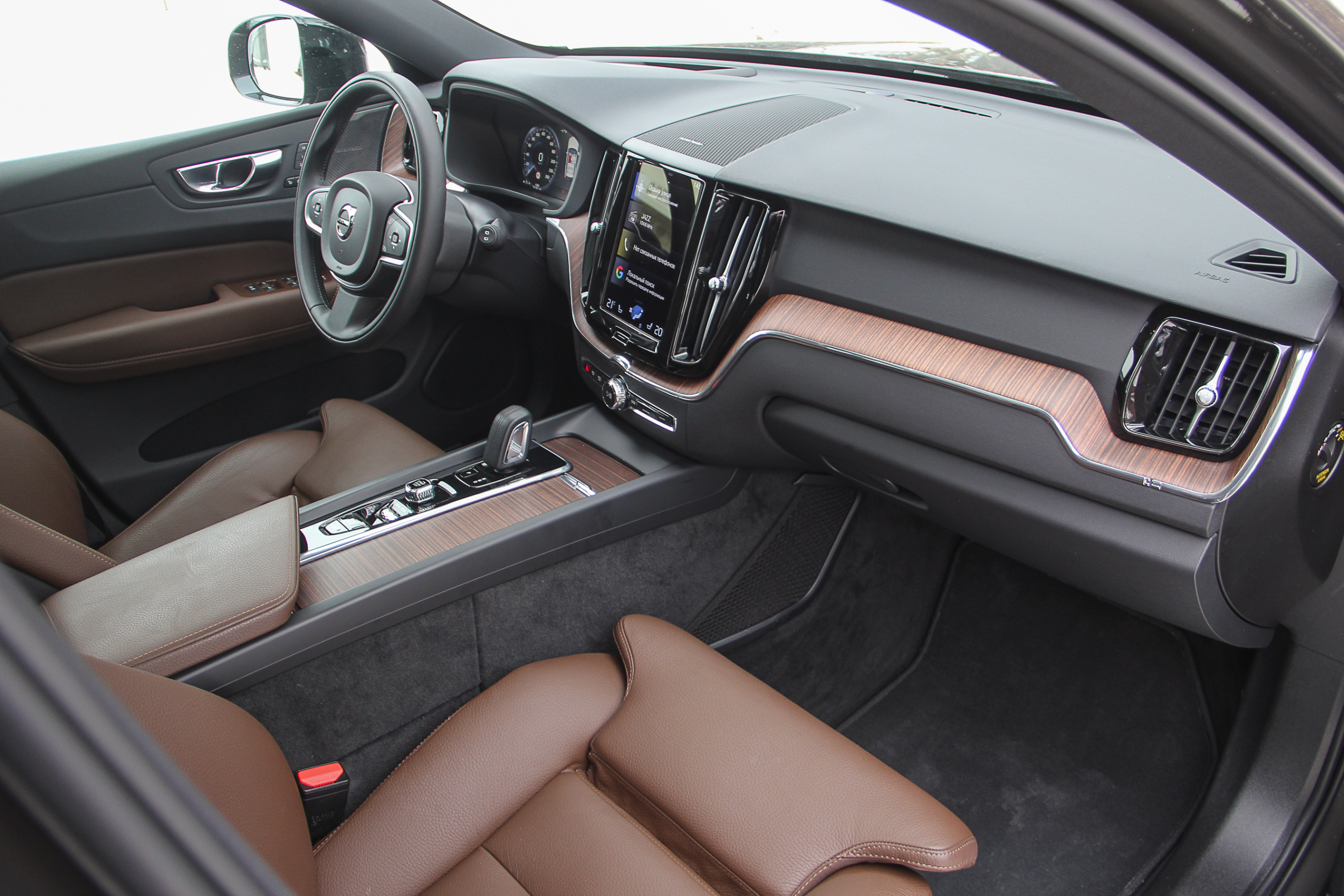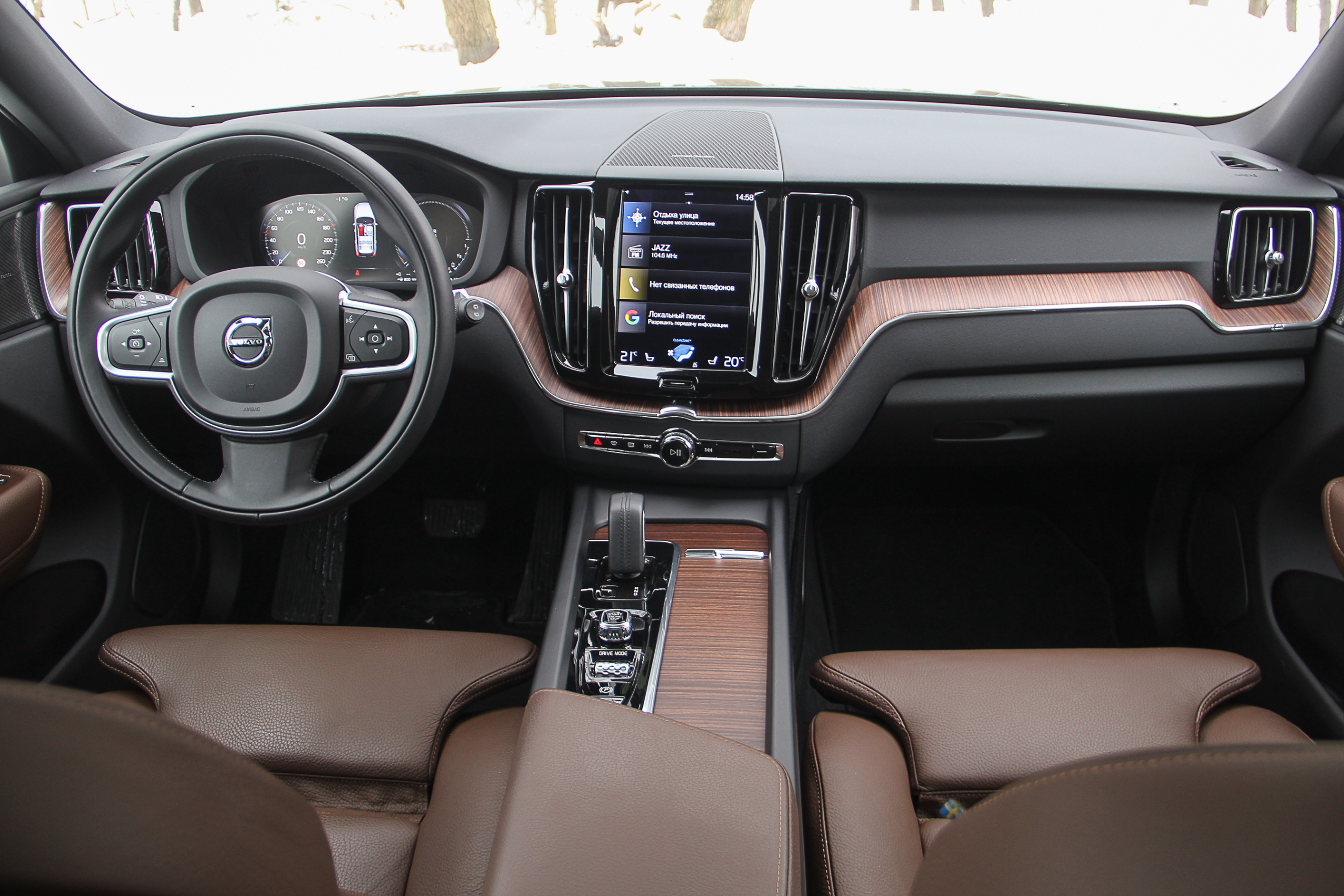 Интерьер Volvo XC60 одновременно уютен и шикарен. Плотная коричневая кожа салона (кажется, такая не потрескается и не сносится никогда!), вставки под дерево ей в тон, отделанные кожей подлокотники и элементы дверных карт, качественный мягкий пластик и немного рояльного лака и элементов хром-металл. И как довершение этого стиля – высококлассная акустика Harman/Kardon Premium Sound! Звучит она великолепно и заслуживает наивысшей оценки, а также быть первым пунктом в списке дополнительных опций – она предлагается за доплату.