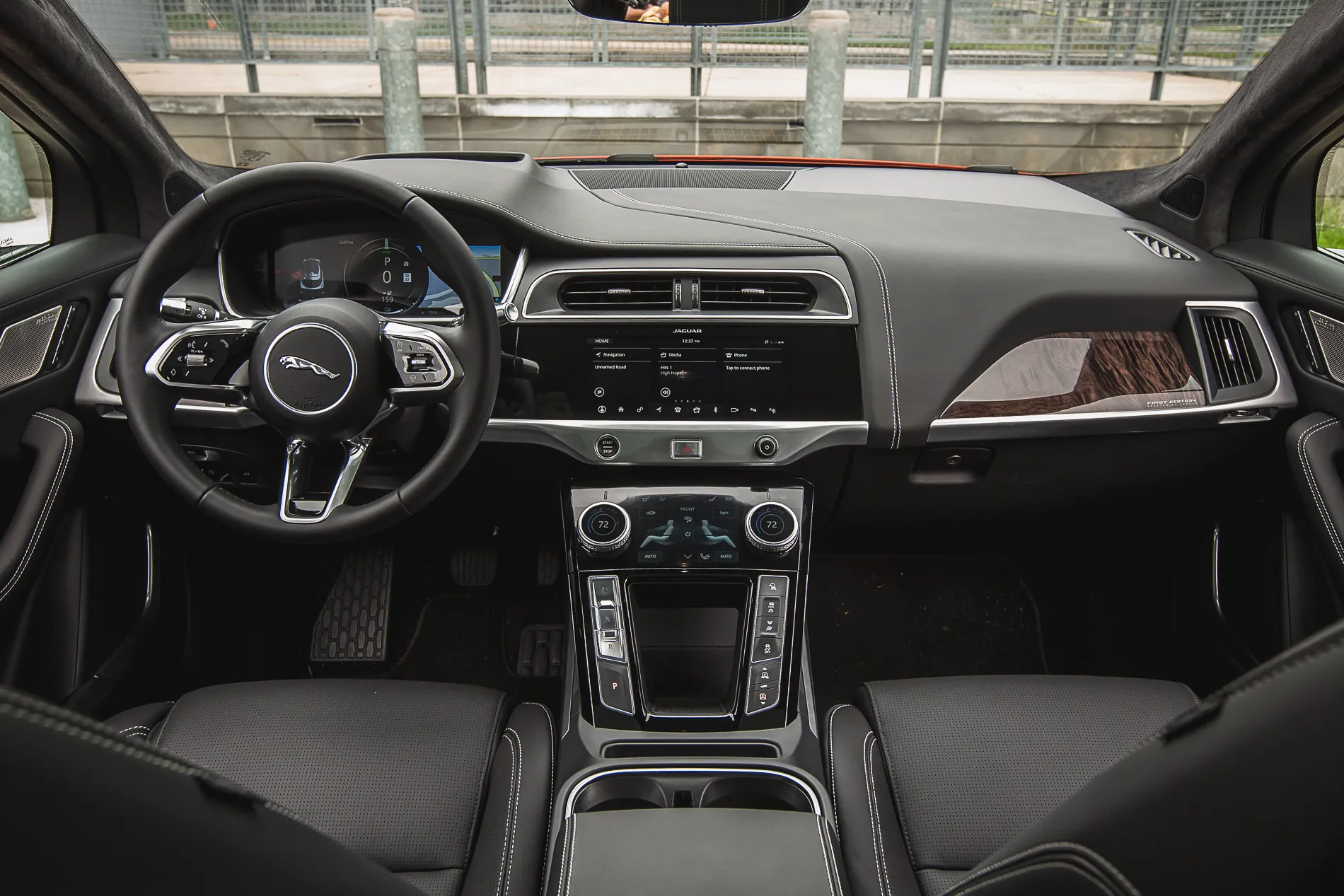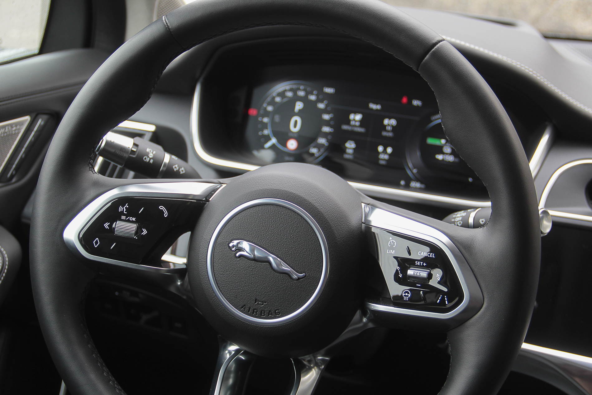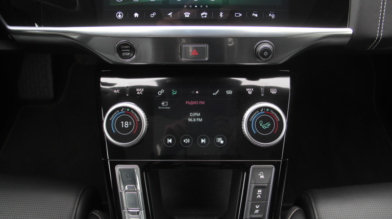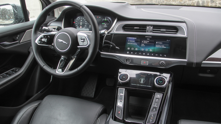 Но из-за этого механизм регулировки температуры и скорости обдува получается замысловатым: чтобы изменить скорость надо потянуть шайбу на себя, а если ее нажать – то это управление уже подогревом сидений. Для вау-эффекта отлично, а вот для ежедневного пользования как-то замысловато. Ну а крупных экранов в I-Pace три – вдобавок к 12.3 дюймовому дисплею приборной панели и 10-дюймовому экрану мультимедиа имеется и 5-дюймовый вспомогательный экранчик. На него выводится либо информация климатической установки либо аудиоданные. Например, выбранная радиостанция. Это реализация концепции Touch Pro Duo, которая известна нам также по Range Rover.