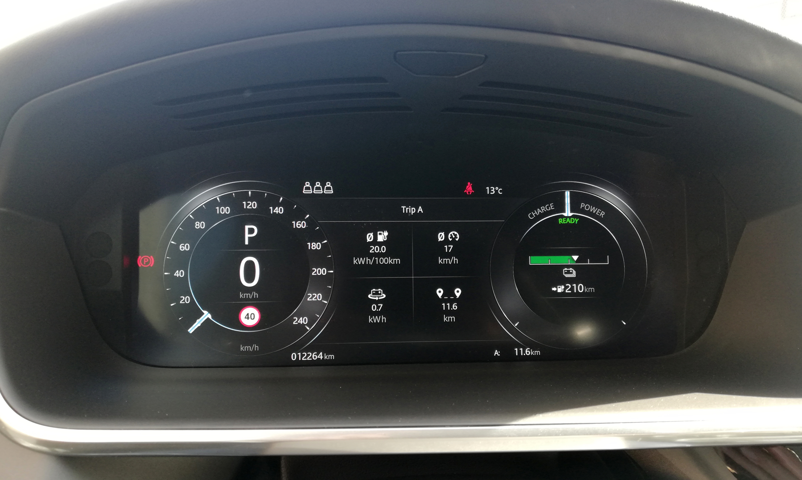 Теперь немного цифр. К вожделенной (и свободной на тот момент!) станции я приехал с батарей на 35% и запасом в 135 км. Буквально полчаса – и у Ягуара уже 50% и 171 км. Но мне этого мало и я жду еще. В итоге за 2 часа зарядки батарея “заполнилась” на 82% и система показала остаток пробега в 300 км. Отмечу, что на 80% электроника машины сама отключает зарядку, оберегая батарею. Я делаю паузу и “доливаю” еще немного энергии: теперь на приборной панели красуется запас хода чуть более 330 км и 90%. Замечу, что чем ближе к ста, тем медленнее скорость зарядки, поэтому дожимать “до полного” не всегда целесообразно.