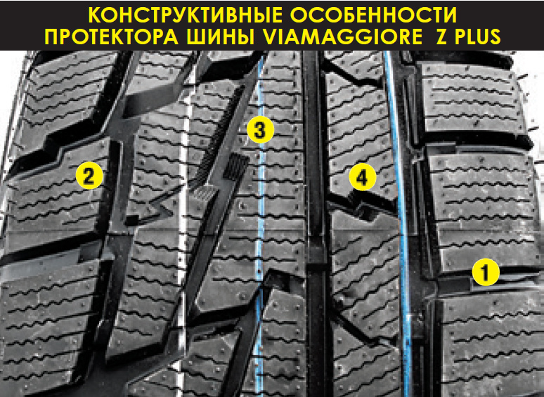 Для эффективного отвода воды из пятна контакта в рисунке протектора предусмотрены две крупные продольные канавки. В свою очередь, для лучших сцепных свойств на снегу и льду блоки протектора имеют ступенчатую форму боковых стенок. В центральном ряду между блоками предусмотрены «карманы» (на фото “4” )для поглощения большего количества воды и снега. Кстати, снег, который накапливается в этих карманах, при качении колеса контактирует со снегом на дороге, имитируя эффект прилипания (по аналогии, когда катают шары для снежной бабы или делают снежки). Но резкий уклон граней между центральными блоками обеспечивает быстрое очищение канавок от налипшего снега.