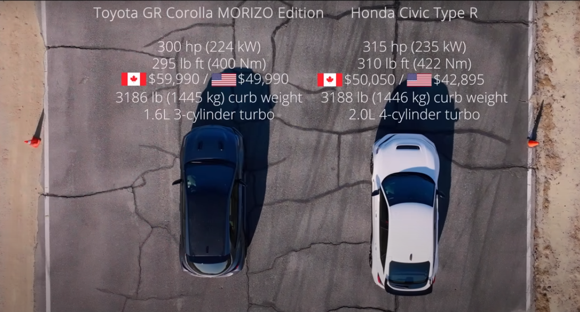 Незважаючи на те, що автомобілі є прямими конкурентами, вони сильно відрізняються один від одного. Toyota GR Corolla оснащена 1,6-літровим трициліндровим турбодвигуном на 300 к.с. та 400 Нм, який пов’язаний із системою повного приводу. А під капотом Honda Civic Type R встановлений 2,0-літровий чотирициліндровий турбомотор із віддачею 315 к.с. та 442 Нм, який працює у парі із системою переднього приводу.