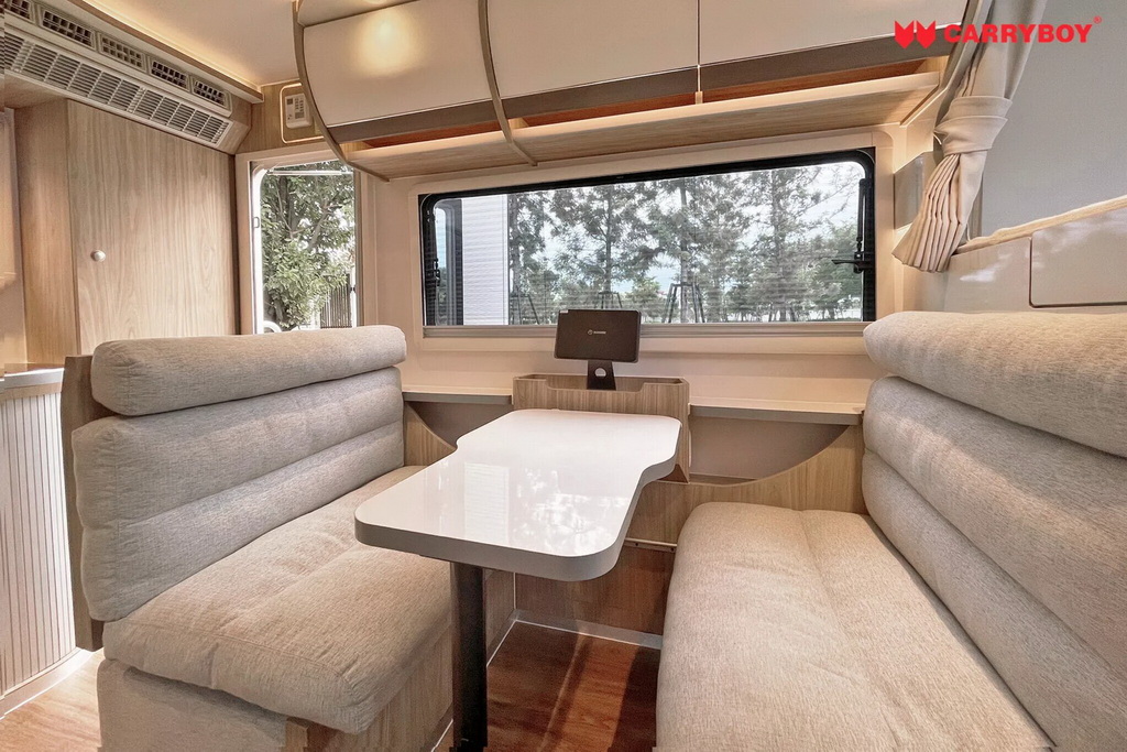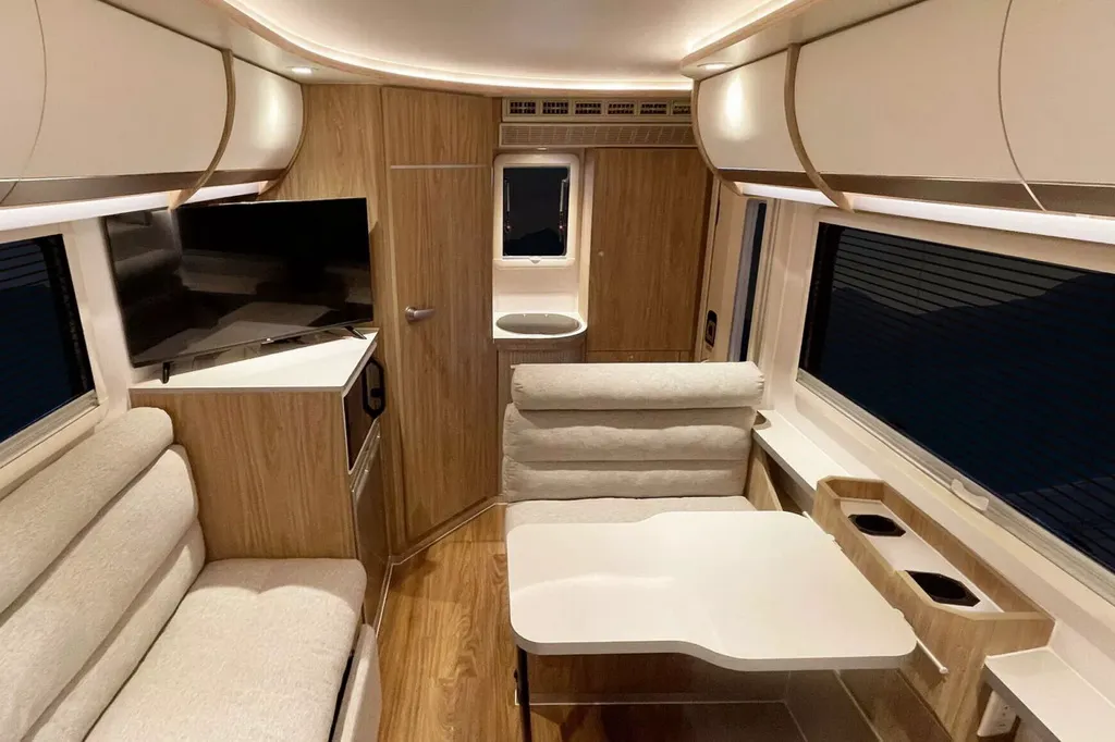 Зручності включають обідній стіл, приховане світлодіодне освітлення, велику кількість відсіків для зберігання речей, жалюзі на вікнах, холодильник на 80 л, кухонну техніку, раковину, 32-дюймовий телевізор та кондиціонер. Зовні компанія додала електричні бічні сходи для легшого доступу, електричний тент та додаткову висувну кухню.