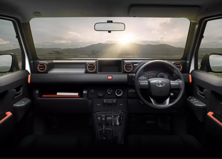 Комфорт салону від зменшення колісної бази не постраждав. У Toyota заявили, що компонування з одинарною кабіною залишає достатньо місця для вантажної платформи, довжина якої становить 1867 мм. Super SWB пропонується в комплектації «Attractive Package». Вона включає кондиціонер, дзеркала з електроприводом і склопідйомники, порт USB Type-C і пару динаміків. Оздоблення салону пікапа виконане чорною тканиною з помаранчевими акцентами.