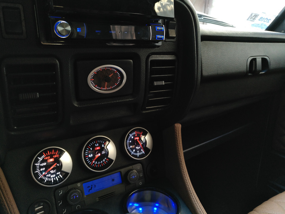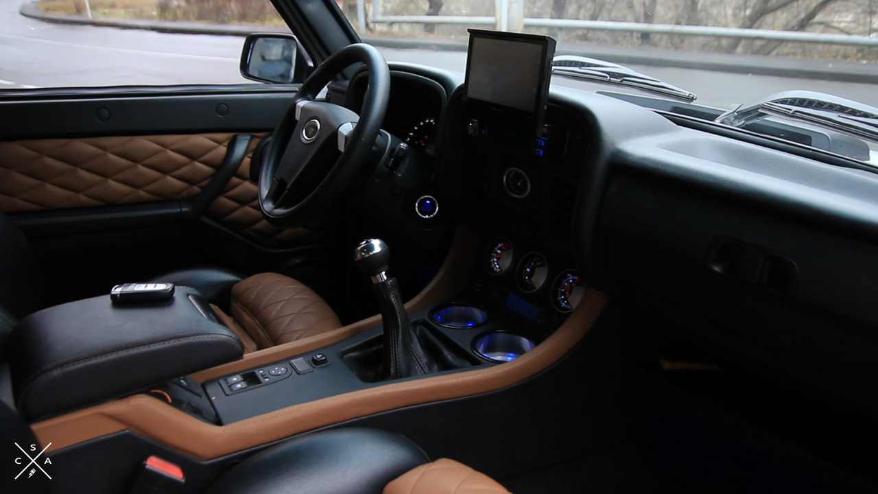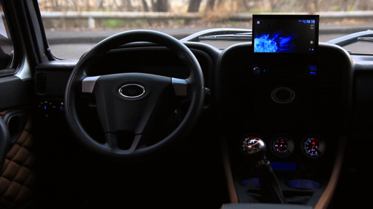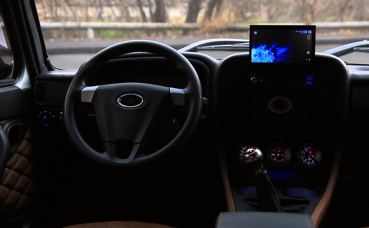 Информативно и современно смотрится панель приборов GAMMA GF826, а важную дополнительную информацию показывают три круглых датчика в центральной консоли. Управление светом – от УАЗ Патриот, зеркалами и стеклоподъемниками – от Datsun On-Do. Подрулевые переключатель взяли у младшей сестры – Шнивы, а кожух рулевой колонки у «десятки».