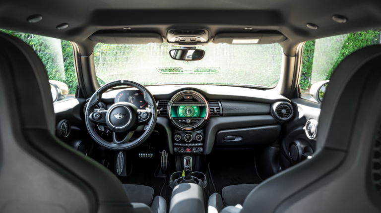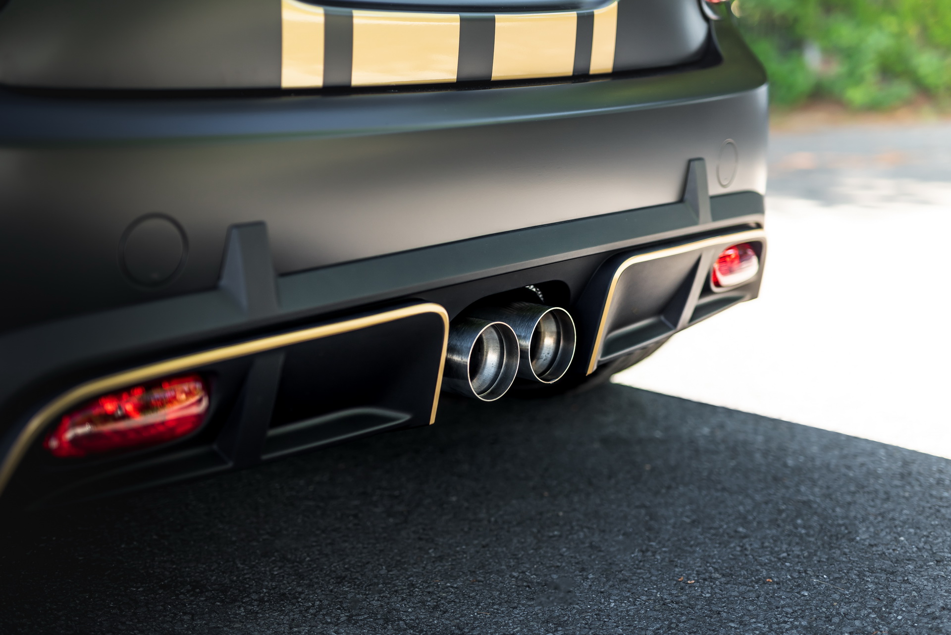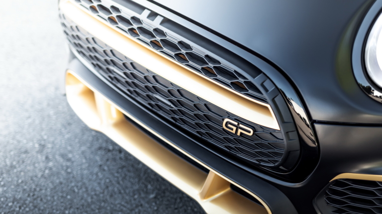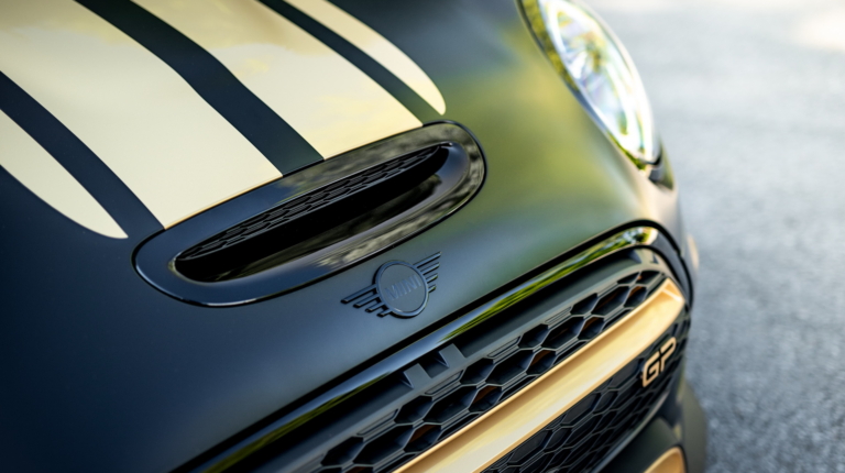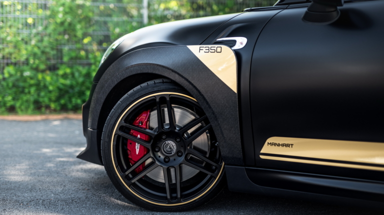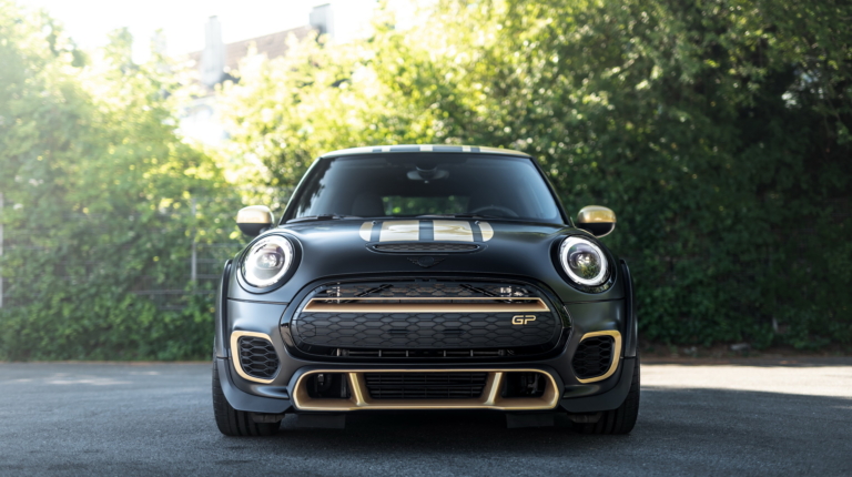 Кузов MINI JCW GP обтянули черной матовой пленкой, которая контрастирует с золотистыми полосами и акцентами. Также хэтчбек получил большое заднее антикрыло, расширенные колесные арки, 19-дюймовые колесные диски Manhart Concave One и переработанную подвеску AST, которая занижает дорожный просвет на 20 мм впереди и 15 мм сзади.