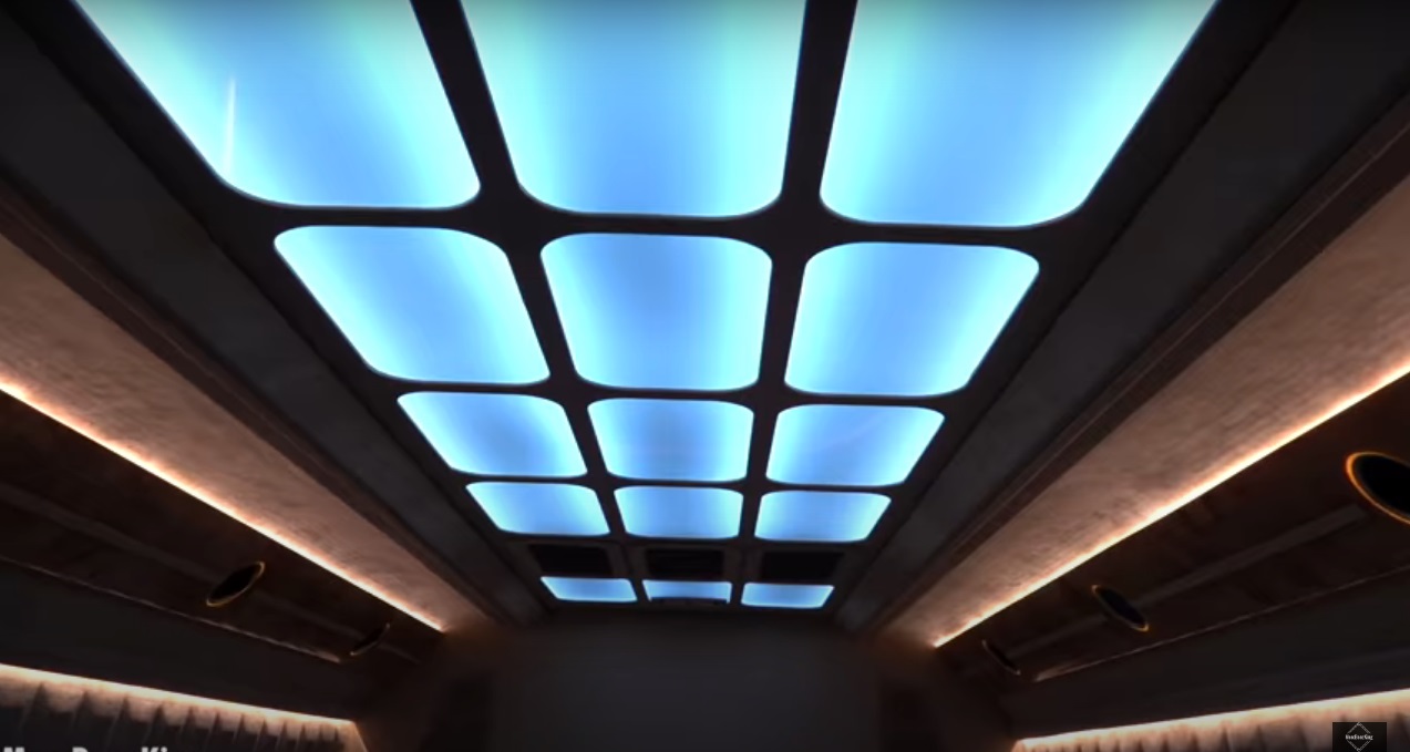 Особый уют придает контурное LED-освещение по салону. Кстати, потолок тоже светится, что делает салон визуально больше. Стекла с глубокой тонировкой изнутри можно закрыть еще и солнцезащитными шторками с электроприводом. На подоконниках встроены USB-разъемы, а также островки для беспроводной зарядки под смартфоны.