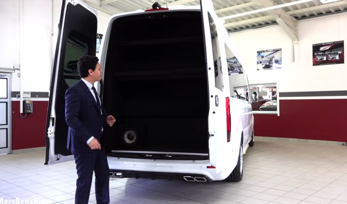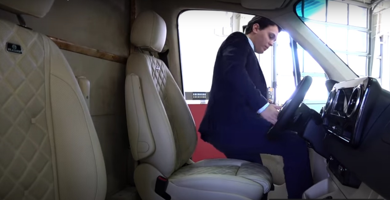 Открыв водительскую дверь, сразу бросается в глаза подножка со светящейся надписью Klassen. Внутри два роскощных кресла, покрытых стеганой кожей цвета слоновой кости, вставки под дерево и хромированные детали. Из дополнительного оборудования отметим пульт управления перегородкой с электроприводом, которая отделяет салон от кабины, а также трубку переговорного устройства между водителем и VIP-пассажирами.