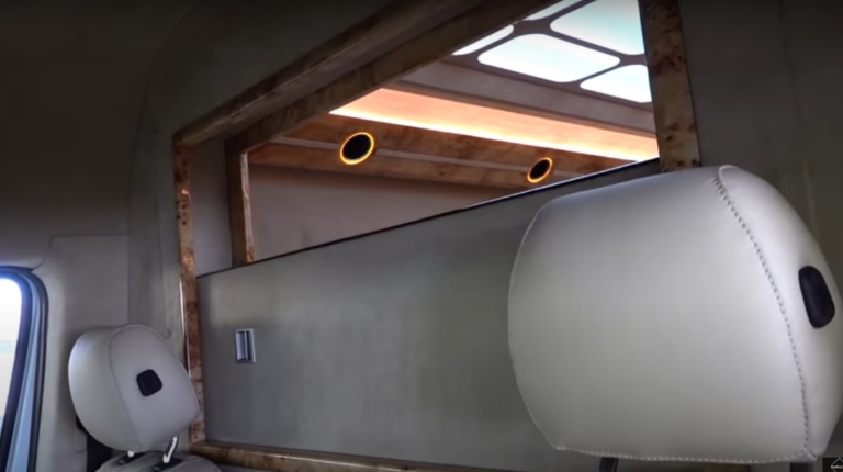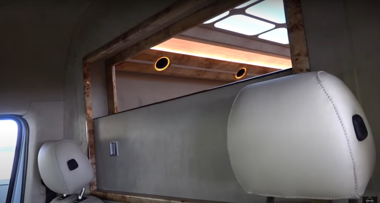 В опускаемой перегородке между кабиной водителя и салоном установлен большой телевизор. А под ним находится минибар, с ящиками для посуды. Слева по борту – вместительный холодильник.