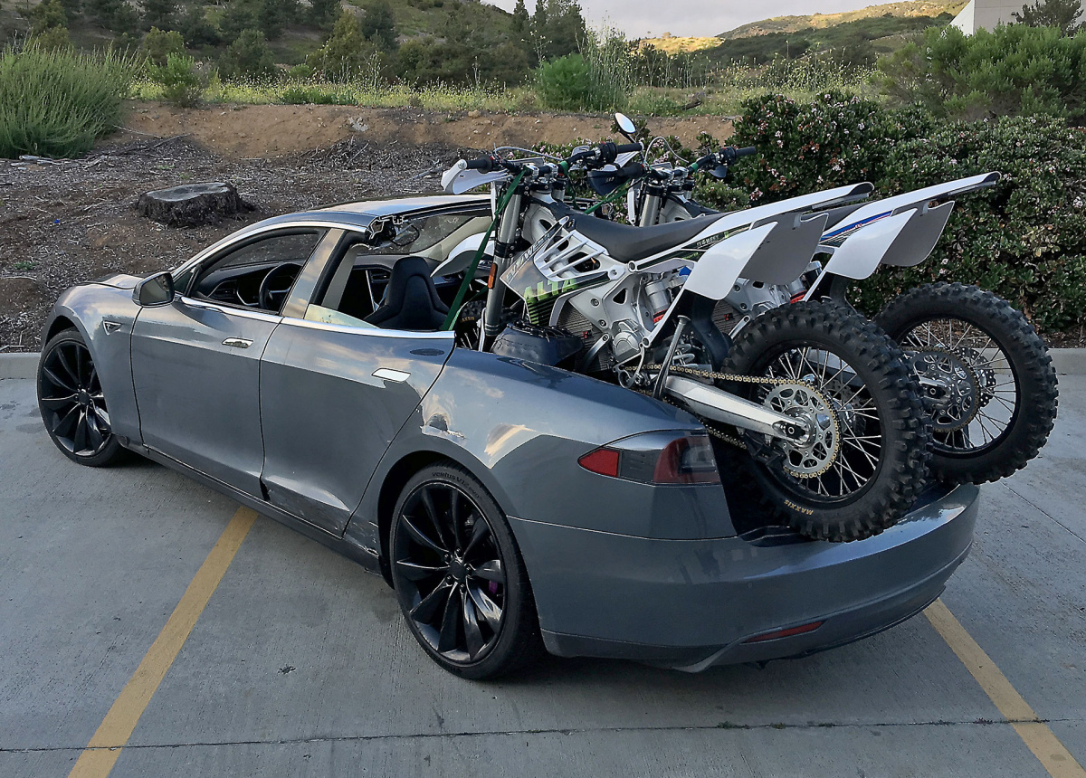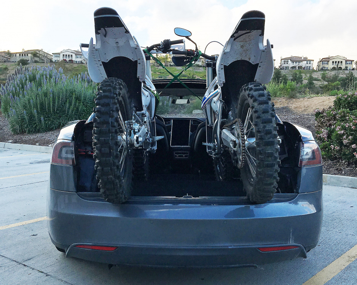 Выбросив задний ряд сидений удалось создать пространство для грузовой площадки, на которой можно разместить два мотоцикла. Более того, под днищем еще и разместили дополнительные батареи, которые увеличили суммарную емкость аккумуляторов на 16 кВтч. Но и это еще не все. Если в кузове перевозяться байки на электротяге, то их можно подзарядить через специальный разъем!