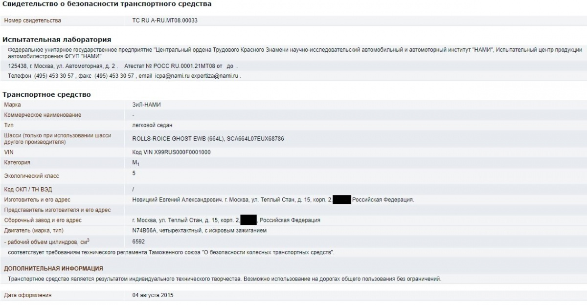 Официально о машине никто ничего не знает как в НАМИ, так и в компании МСЦ6 АМО ЗИЛ, которая приобрела цех по изготовлению легковых автомобилей ЗИЛ. А вот в базе Росстандарта удалось найти Свидетельство о безопасности транспортного средства (см. фото). Тут изготовителем фигурирует некое ООО «Луна» из Москвы, занимающееся продажей автомобилей, и возглавляемое Евгением Новицким. Испытания машины проходили все-таки в НАМИ.