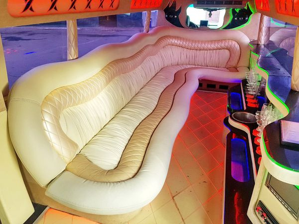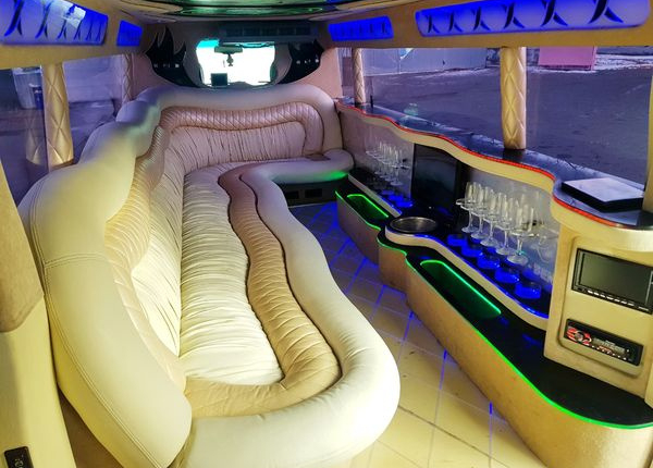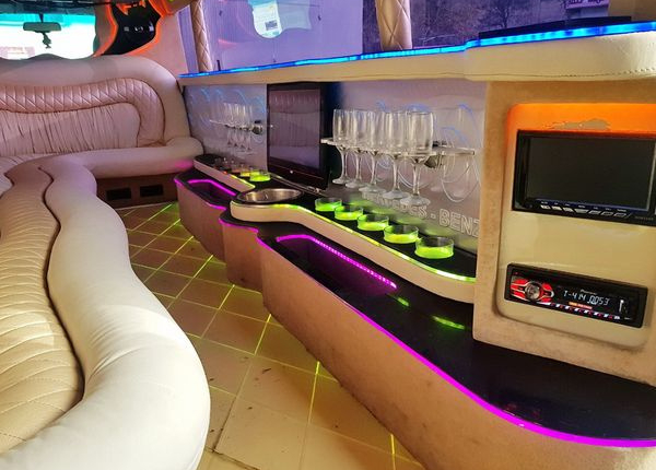 В салоне чего только нет для максимального комфорта гостей. Тут и диваны и бежевой кожи, и минибар, и караоке, диско пол и диско потолок, есть три больших экрана и DVD. Имеется также дым машина. На сайте прокатной конторы AvtoLimo сообщается, что автомобиль имеет ламбодвери. Правда, по фотографиям этого не видно, за то видны подножки с электроприводом.