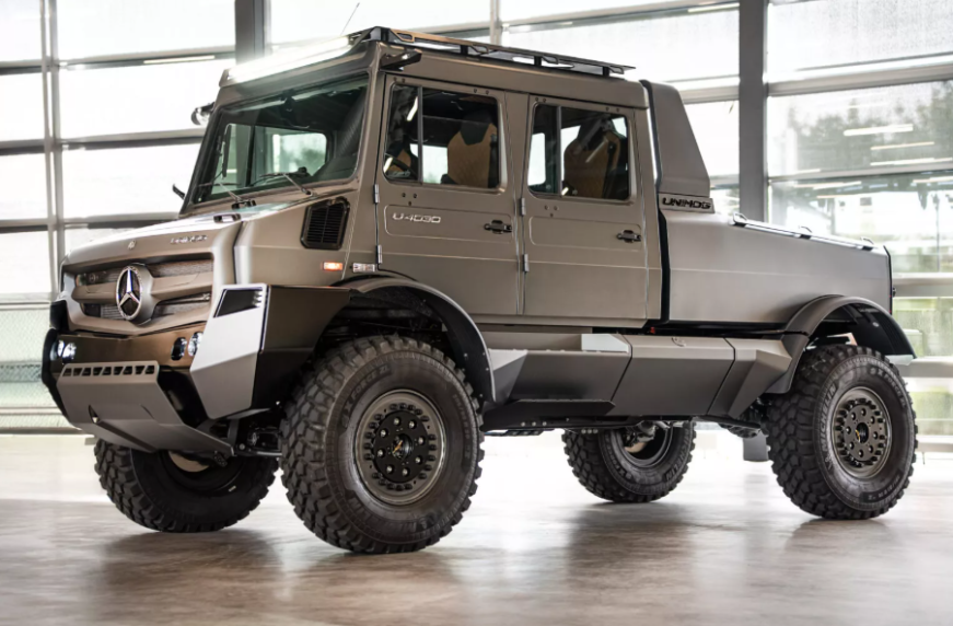 Оптику замінили на світлодіодну, встановили багажник на даху і особливий обвіс. Традиційні дзеркала заднього виду замінили на камери. Їздить Unimog на 20-дюймових дисках з бедлоками. Екстер’єр новинки являє собою баланс між грубою силою і вишуканою елегантністю. Що стосується салону авто, то він виглядає розкішно.