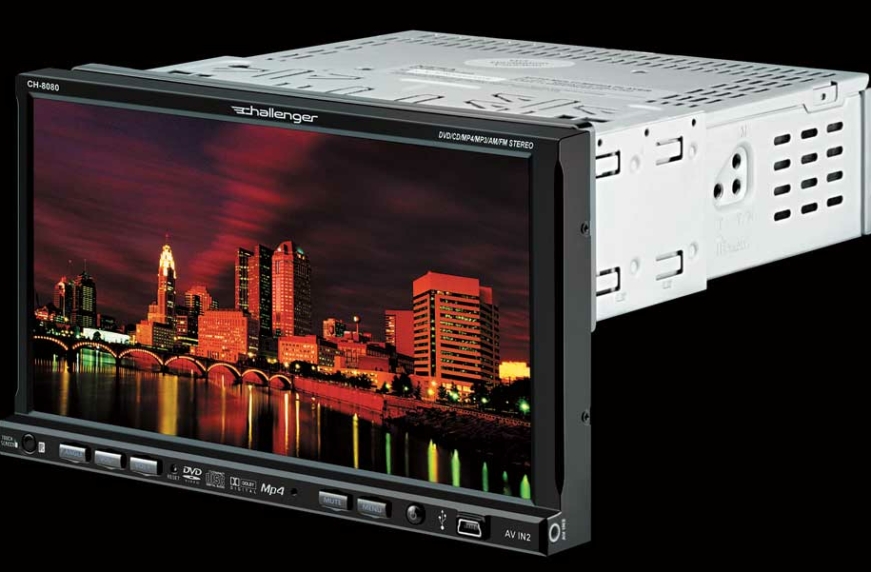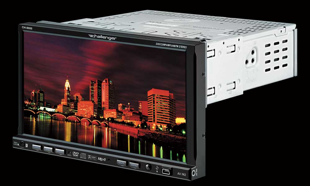 При виде этого устройства формата 1DIN с 7-дюймовым экраном – Challenger CH 8080 – непроизвольно вырывается возглас удивления. Впрочем, подобные модели есть у той же марки, но они отличаются только 5,3-дюймовым монитором. В «однодиновом» корпусе CH 8080 помещается вся начинка, необходимая для «всеядного» аппарата, носящего почетный титул мультимедийной станции. «Свисающий» сенсорный монитор для улучшения обзора можно выставлять под разными углами при помощи электропривода – это пригодится не только любителям автомобильного видео, но и тем, кто подключит к экрану устройства камеру заднего вида. Стоимость 2 020 грн.