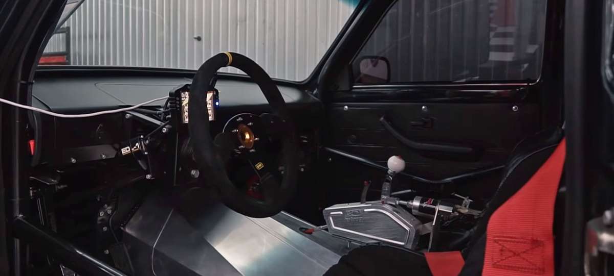 Естественно, ходовая часть такой Нивы также полностью переделана. Передний мост от Chevrolet, задний – от пикапа Ford, а рулевой механизм позаимствован у BMW. Аскетичный салон заточен на драг, но при этом не лишен электростеклоподъемников.
